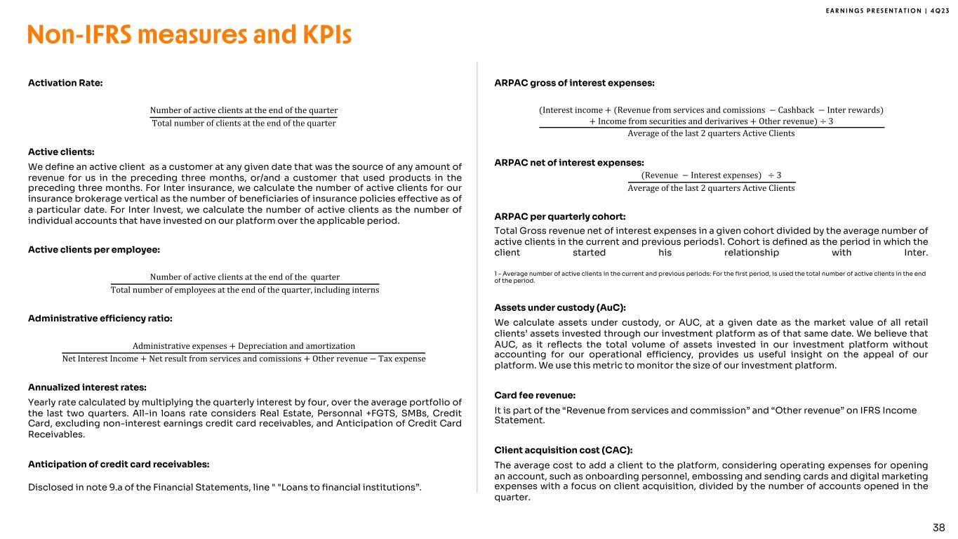 E A R N I N G S P R E S E N T A T I O N | 4 Q 2 3 Non-IFRS measures and KPIs 38 Activation Rate: Number of active clients at the end of the quarter Total number of clients at the end of the quarter Active clients: We define an active client as a customer at any given date that was the source of any amount of revenue for us in the preceding three months, or/and a customer that used products in the preceding three months. For Inter insurance, we calculate the number of active clients for our insurance brokerage vertical as the number of beneficiaries of insurance policies effective as of a particular date. For Inter Invest, we calculate the number of active clients as the number of individual accounts that have invested on our platform over the applicable period. Active clients per employee: Number of active clients at the end of the quarter Total number of employees at the end of the quarter, including interns Administrative efficiency ratio: Administrative expenses + Depreciation and amortization Net Interest Income + Net result from services and comissions + Other revenue − Tax expense Annualized interest rates: Yearly rate calculated by multiplying the quarterly interest by four, over the average portfolio of the last two quarters. All-in loans rate considers Real Estate, Personnal +FGTS, SMBs, Credit Card, excluding non-interest earnings credit card receivables, and Anticipation of Credit Card Receivables. Anticipation of credit card receivables: Disclosed in note 9.a of the Financial Statements, line " "Loans to financial institutions”. ARPAC gross of interest expenses: (Interest income + (Revenue from services and comissions − Cashback − Inter rewards) + Income from securities and derivarives + Other revenue) ÷ 3 Average of the last 2 quarters Active Clients ARPAC net of interest expenses: (Revenue − Interest expenses) ÷ 3 Average of the last 2 quarters Active Clients ARPAC per quarterly cohort: Total Gross revenue net of interest expenses in a given cohort divided by the average number of active clients in the current and previous periods1. Cohort is defined as the period in which the client started his relationship with Inter. 1 - Average number of active clients in the current and previous periods: For the first period, is used the total number of active clients in the end of the period. Assets under custody (AuC): We calculate assets under custody, or AUC, at a given date as the market value of all retail clients’ assets invested through our investment platform as of that same date. We believe that AUC, as it reflects the total volume of assets invested in our investment platform without accounting for our operational efficiency, provides us useful insight on the appeal of our platform. We use this metric to monitor the size of our investment platform. Card fee revenue: It is part of the “Revenue from services and commission” and “Other revenue” on IFRS Income Statement. Client acquisition cost (CAC): The average cost to add a client to the platform, considering operating expenses for opening an account, such as onboarding personnel, embossing and sending cards and digital marketing expenses with a focus on client acquisition, divided by the number of accounts opened in the quarter.