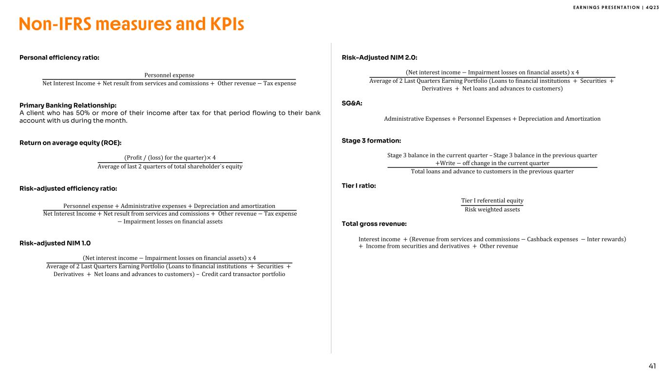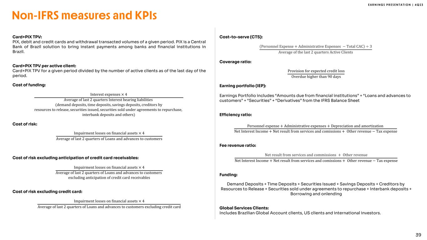 E A R N I N G S P R E S E N T A T I O N | 4 Q 2 3 39 Card+PIX TPV: PIX, debit and credit cards and withdrawal transacted volumes of a given period. PIX is a Central Bank of Brazil solution to bring instant payments among banks and financial institutions in Brazil. Card+PIX TPV per active client: Card+PIX TPV for a given period divided by the number of active clients as of the last day of the period. Cost of funding: Interest expenses × 4 Average of last 2 quarters Interest bearing liabilities (demand deposits, time deposits, savings deposits, creditors by resources to release, securities issued, securities sold under agreements to repurchase, interbank deposits and others) Cost of risk: Impairment losses on Minancial assets × 4 Average of last 2 quarters of Loans and advances to customers Cost of risk excluding anticipation of credit card receivables: Impairment losses on Minancial assets × 4 Average of last 2 quarters of Loans and advances to customers excluding anticipation of credit card receivables Cost of risk excluding credit card: Impairment losses on Minancial assets × 4 Average of last 2 quarters of Loans and advances to customers excluding credit card Cost-to-serve (CTS): Personnel Expense + Administrative Expenses − Total CAC ÷ 3 Average of the last 2 quarters Active Clients Coverage ratio: Provision for expected credit loss Overdue higher than 90 days Earning portfolio (IEP): Earnings Portfolio includes “Amounts due from financial institutions” + “Loans and advances to customers” + “Securities” + “Derivatives” from the IFRS Balance Sheet Efficiency ratio: Personnel expense + Administrative expenses + Depreciation and amortization Net Interest Income + Net result from services and comissions + Other revenue − Tax expense Fee revenue ratio: Net result from services and commissions + Other revenue Net Interest Income + Net result from services and comissions + Other revenue − Tax expense Funding: Demand Deposits + Time Deposits + Securities Issued + Savings Deposits + Creditors by Resources to Release + Securities sold under agreements to repurchase + Interbank deposits + Borrowing and onlending Global Services Clients: Includes Brazilian Global Account clients, US clients and international investors. Non-IFRS measures and KPIs