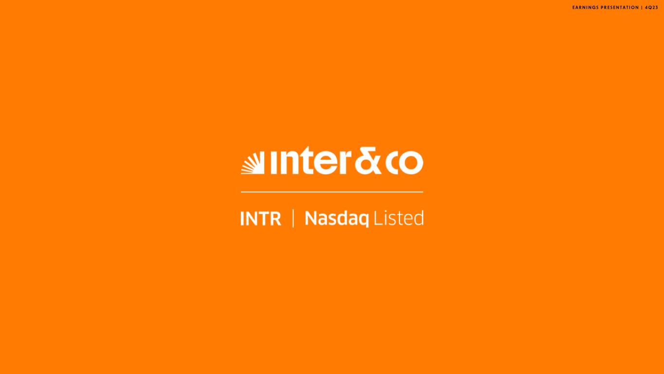 E A R N I N G S P R E S E N T A T I O N | 4 Q 2 3 40 Gross loan portfolio: Loans and Advance to Customers + Loans to financial institutions Gross merchandise volume (GMV): Gross merchandise value, or GMV, for a given period as the total value of all sales made or initiated through our Inter Shop & Commerce Plus platform managed by Inter Shop & Commerce Plus. Gross take rate: Inter Shop gross revenue GMV Margin per active client gross of interest expenses: ARPAC gross of interest expenses – Cost to Serve Margin per active client net of interest expenses: ARPAC net of interest expenses – Cost to Serve Net fee income: Net result from services and commissions + Other Revenue Net interest income: Interest Income + Interest Expenses + Income from securities and derivatives Net revenue: Net interest income + Net result from services and commissions + Other revenue Net take rate: Inter Shop net revenue GMV NIM 1.0 – IEP – Credit Card Transactional Portfolio: Net interest income x 4 Average of 2 Last Quarters Earning Portfolio (Loans to Minancial institutions + Securities + Derivatives + Net loans and advances to customers) – Credit card transactor portfolio NIM 2.0 – IEP Only: Net interest income x 4 Average of 2 Last Quarters Earning Portfolio (Loans to Minancial institutions + Securities + Derivatives + Net loans and advances to customers) NPL 15 to 90 days: Overdue 15 to 90 days Loans and Advance to Costumers + Loans to Minancial institutions NPL > 90 days: Overdue higher than 90 days Loans and Advance to Costumers + Loans to Minancial institutions NPL formation: Overdue balance higher than 90 days in the current quarter – Overdue balance higher than 90 days inthe previous quarter + Write − off change in the current quarter Total loans and advance to customers in the previous quarter Non-IFRS measures and KPIs
