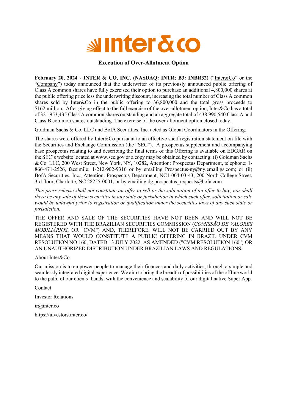 [AM_ACTIVE 405756656_3] Execution of Over-Allotment Option February 20, 2024 - INTER & CO, INC. (NASDAQ: INTR; B3: INBR32) (“Inter&Co” or the “Company”) today announced that the underwriter of its previously announced public offering of Class A common shares have fully exercised their option to purchase an additional 4,800,000 shares at the public offering price less the underwriting discount, increasing the total number of Class A common shares sold by Inter&Co in the public offering to 36,800,000 and the total gross proceeds to $162 million. After giving effect to the full exercise of the over-allotment option, Inter&Co has a total of 321,953,435 Class A common shares outstanding and an aggregate total of 438,990,540 Class A and Class B common shares outstanding. The exercise of the over-allotment option closed today. Goldman Sachs & Co. LLC and BofA Securities, Inc. acted as Global Coordinators in the Offering. The shares were offered by Inter&Co pursuant to an effective shelf registration statement on file with the Securities and Exchange Commission (the “SEC”). A prospectus supplement and accompanying base prospectus relating to and describing the final terms of this Offering is available on EDGAR on the SEC’s website located at www.sec.gov or a copy may be obtained by contacting: (i) Goldman Sachs & Co. LLC, 200 West Street, New York, NY, 10282, Attention: Prospectus Department, telephone: 1- 866-471-2526, facsimile: 1-212-902-9316 or by emailing Prospectus-ny@ny.email.gs.com; or (ii) BofA Securities, Inc., Attention: Prospectus Department, NC1-004-03-43, 200 North College Street, 3rd floor, Charlotte, NC 28255-0001, or by emailing dg.prospectus_requests@bofa.com. This press release shall not constitute an offer to sell or the solicitation of an offer to buy, nor shall there be any sale of these securities in any state or jurisdiction in which such offer, solicitation or sale would be unlawful prior to registration or qualification under the securities laws of any such state or jurisdiction. THE OFFER AND SALE OF THE SECURITIES HAVE NOT BEEN AND WILL NOT BE REGISTERED WITH THE BRAZILIAN SECURITIES COMMISSION (COMISSÃO DE VALORES MOBILIÁRIOS, OR "CVM") AND, THEREFORE, WILL NOT BE CARRIED OUT BY ANY MEANS THAT WOULD CONSTITUTE A PUBLIC OFFERING IN BRAZIL UNDER CVM RESOLUTION NO 160, DATED 13 JULY 2022, AS AMENDED ("CVM RESOLUTION 160”) OR AN UNAUTHORIZED DISTRIBUTION UNDER BRAZILIAN LAWS AND REGULATIONS. About Inter&Co Our mission is to empower people to manage their finances and daily activities, through a simple and seamlessly integrated digital experience. We aim to bring the breadth of possibilities of the offline world to the palm of our clients’ hands, with the convenience and scalability of our digital native Super App. Contact Investor Relations ir@inter.co https://investors.inter.co/