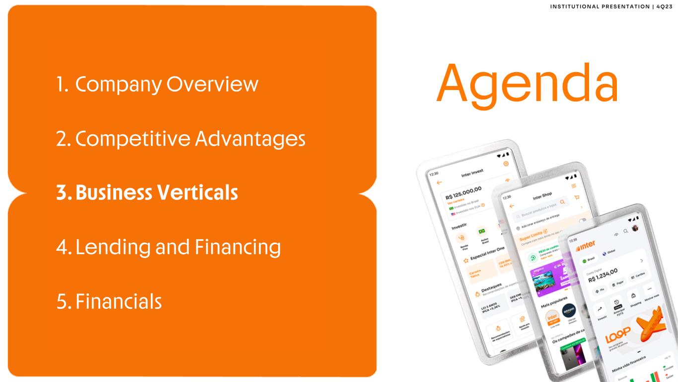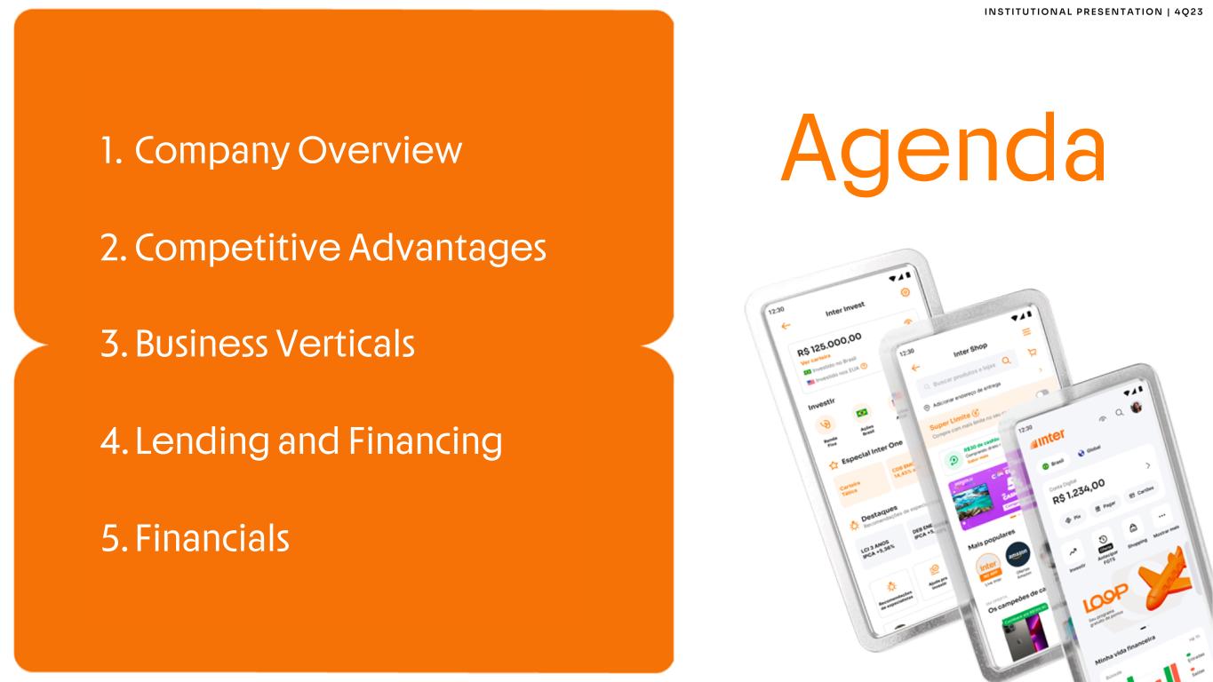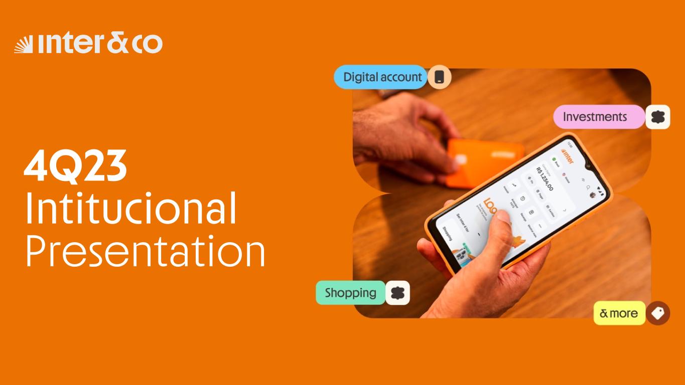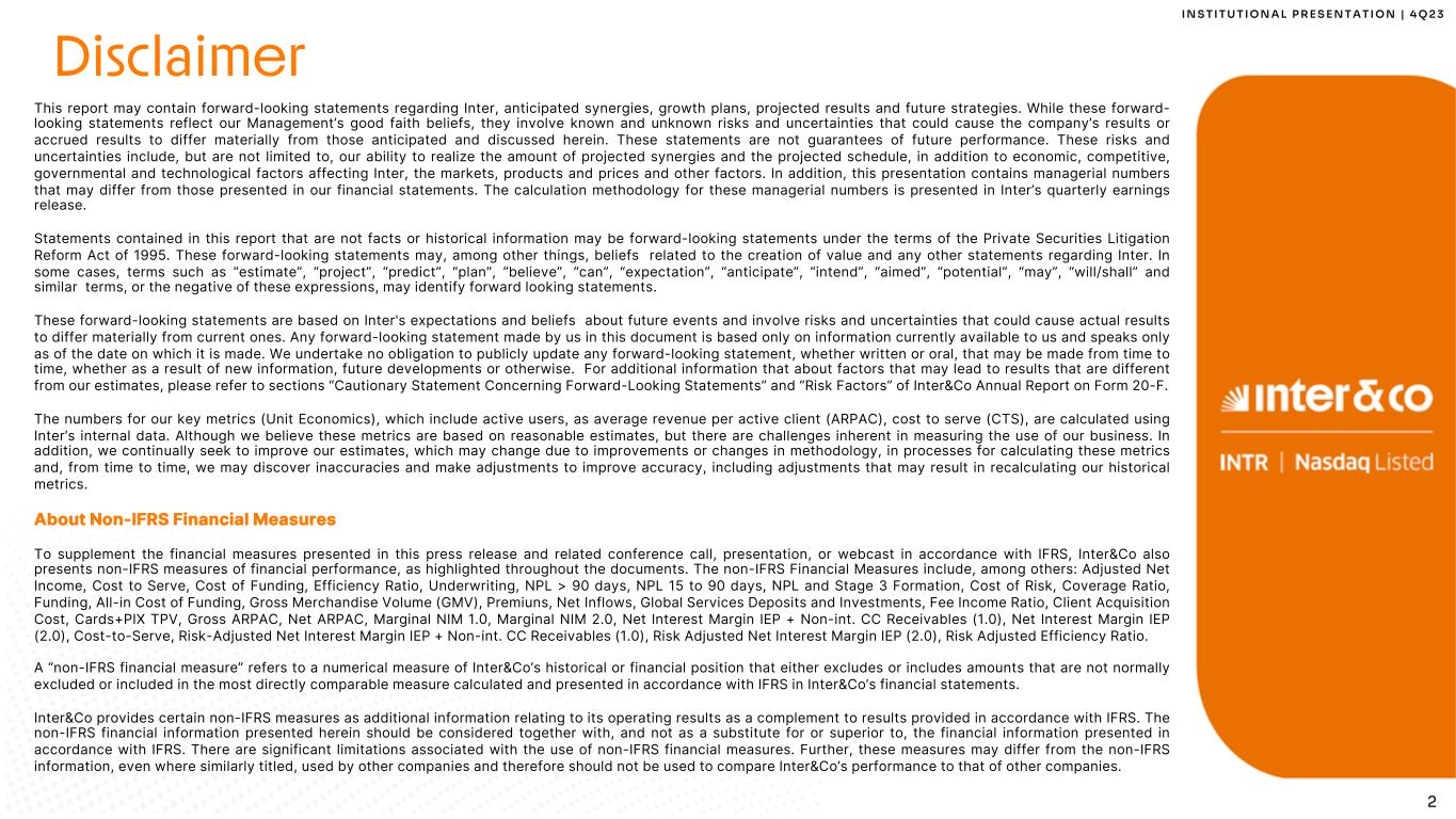2 I N S T I T U T I O N A L P R E S E N T A T I O N | 4 Q 2 3 This report may contain forward-looking statements regarding Inter, anticipated synergies, growth plans, projected results and future strategies. While these forward- looking statements reflect our Management’s good faith beliefs, they involve known and unknown risks and uncertainties that could cause the company’s results or accrued results to differ materially from those anticipated and discussed herein. These statements are not guarantees of future performance. These risks and uncertainties include, but are not limited to, our ability to realize the amount of projected synergies and the projected schedule, in addition to economic, competitive, governmental and technological factors affecting Inter, the markets, products and prices and other factors. In addition, this presentation contains managerial numbers that may differ from those presented in our financial statements. The calculation methodology for these managerial numbers is presented in Inter’s quarterly earnings release. Statements contained in this report that are not facts or historical information may be forward-looking statements under the terms of the Private Securities Litigation Reform Act of 1995. These forward-looking statements may, among other things, beliefs related to the creation of value and any other statements regarding Inter. In some cases, terms such as “estimate”, “project”, “predict”, “plan”, “believe”, “can”, “expectation”, “anticipate”, “intend”, “aimed”, “potential”, “may”, “will/shall” and similar terms, or the negative of these expressions, may identify forward looking statements. These forward-looking statements are based on Inter's expectations and beliefs about future events and involve risks and uncertainties that could cause actual results to differ materially from current ones. Any forward-looking statement made by us in this document is based only on information currently available to us and speaks only as of the date on which it is made. We undertake no obligation to publicly update any forward-looking statement, whether written or oral, that may be made from time to time, whether as a result of new information, future developments or otherwise. For additional information that about factors that may lead to results that are different from our estimates, please refer to sections “Cautionary Statement Concerning Forward-Looking Statements” and “Risk Factors” of Inter&Co Annual Report on Form 20-F. The numbers for our key metrics (Unit Economics), which include active users, as average revenue per active client (ARPAC), cost to serve (CTS), are calculated using Inter’s internal data. Although we believe these metrics are based on reasonable estimates, but there are challenges inherent in measuring the use of our business. In addition, we continually seek to improve our estimates, which may change due to improvements or changes in methodology, in processes for calculating these metrics and, from time to time, we may discover inaccuracies and make adjustments to improve accuracy, including adjustments that may result in recalculating our historical metrics. About Non-IFRS Financial Measures To supplement the financial measures presented in this press release and related conference call, presentation, or webcast in accordance with IFRS, Inter&Co also presents non-IFRS measures of financial performance, as highlighted throughout the documents. The non-IFRS Financial Measures include, among others: Adjusted Net Income, Cost to Serve, Cost of Funding, Efficiency Ratio, Underwriting, NPL > 90 days, NPL 15 to 90 days, NPL and Stage 3 Formation, Cost of Risk, Coverage Ratio, Funding, All-in Cost of Funding, Gross Merchandise Volume (GMV), Premiuns, Net Inflows, Global Services Deposits and Investments, Fee Income Ratio, Client Acquisition Cost, Cards+PIX TPV, Gross ARPAC, Net ARPAC, Marginal NIM 1.0, Marginal NIM 2.0, Net Interest Margin IEP + Non-int. CC Receivables (1.0), Net Interest Margin IEP (2.0), Cost-to-Serve, Risk-Adjusted Net Interest Margin IEP + Non-int. CC Receivables (1.0), Risk Adjusted Net Interest Margin IEP (2.0), Risk Adjusted Efficiency Ratio. A “non-IFRS financial measure” refers to a numerical measure of Inter&Co’s historical or financial position that either excludes or includes amounts that are not normally excluded or included in the most directly comparable measure calculated and presented in accordance with IFRS in Inter&Co’s financial statements. Inter&Co provides certain non-IFRS measures as additional information relating to its operating results as a complement to results provided in accordance with IFRS. The non-IFRS financial information presented herein should be considered together with, and not as a substitute for or superior to, the financial information presented in accordance with IFRS. There are significant limitations associated with the use of non-IFRS financial measures. Further, these measures may differ from the non-IFRS information, even where similarly titled, used by other companies and therefore should not be used to compare Inter&Co’s performance to that of other companies. Disclaimer