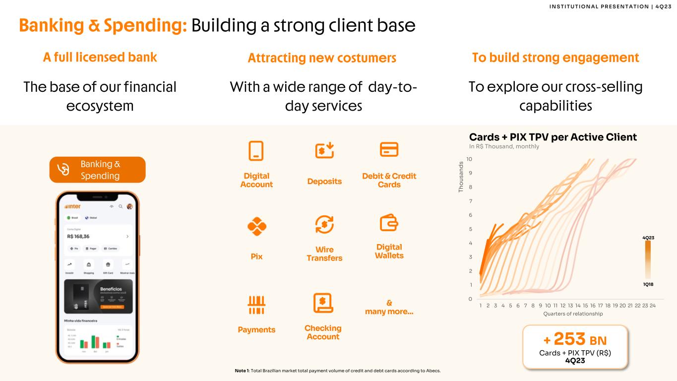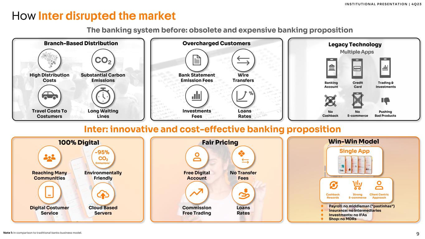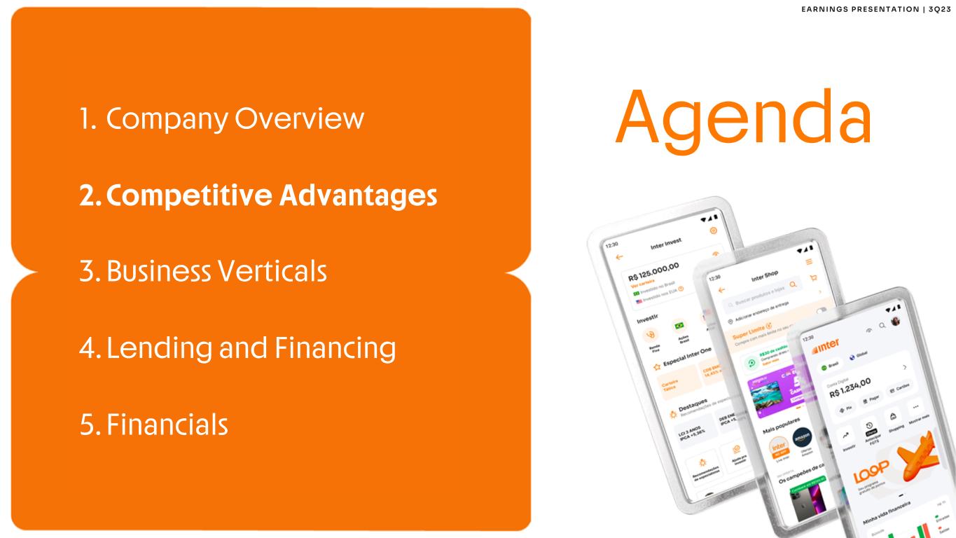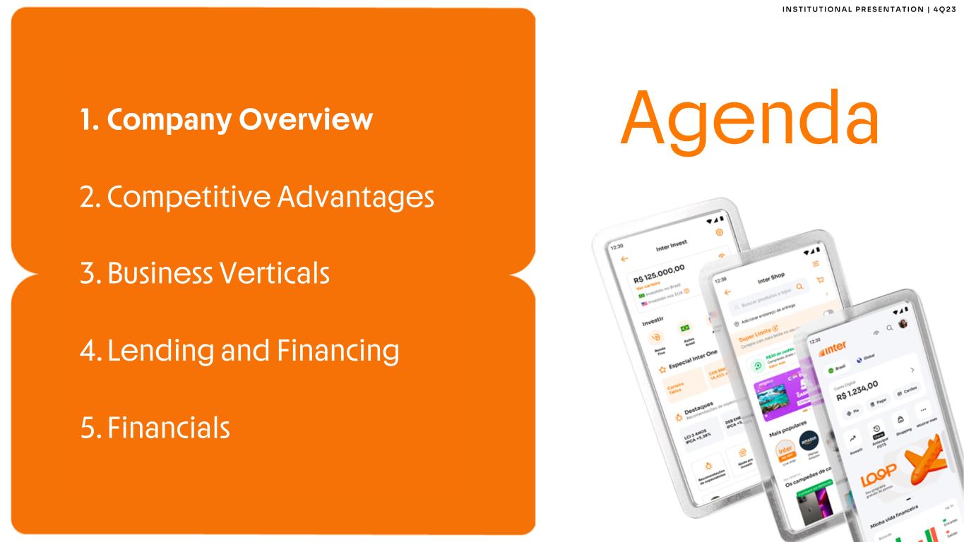 2 I N S T I T U T I O N A L P R E S E N T A T I O N | 4 Q 2 3 This report may contain forward-looking statements regarding Inter, anticipated synergies, growth plans, projected results and future strategies. While these forward- looking statements reflect our Management’s good faith beliefs, they involve known and unknown risks and uncertainties that could cause the company’s results or accrued results to differ materially from those anticipated and discussed herein. These statements are not guarantees of future performance. These risks and uncertainties include, but are not limited to, our ability to realize the amount of projected synergies and the projected schedule, in addition to economic, competitive, governmental and technological factors affecting Inter, the markets, products and prices and other factors. In addition, this presentation contains managerial numbers that may differ from those presented in our financial statements. The calculation methodology for these managerial numbers is presented in Inter’s quarterly earnings release. Statements contained in this report that are not facts or historical information may be forward-looking statements under the terms of the Private Securities Litigation Reform Act of 1995. These forward-looking statements may, among other things, beliefs related to the creation of value and any other statements regarding Inter. In some cases, terms such as “estimate”, “project”, “predict”, “plan”, “believe”, “can”, “expectation”, “anticipate”, “intend”, “aimed”, “potential”, “may”, “will/shall” and similar terms, or the negative of these expressions, may identify forward looking statements. These forward-looking statements are based on Inter's expectations and beliefs about future events and involve risks and uncertainties that could cause actual results to differ materially from current ones. Any forward-looking statement made by us in this document is based only on information currently available to us and speaks only as of the date on which it is made. We undertake no obligation to publicly update any forward-looking statement, whether written or oral, that may be made from time to time, whether as a result of new information, future developments or otherwise. For additional information that about factors that may lead to results that are different from our estimates, please refer to sections “Cautionary Statement Concerning Forward-Looking Statements” and “Risk Factors” of Inter&Co Annual Report on Form 20-F. The numbers for our key metrics (Unit Economics), which include active users, as average revenue per active client (ARPAC), cost to serve (CTS), are calculated using Inter’s internal data. Although we believe these metrics are based on reasonable estimates, but there are challenges inherent in measuring the use of our business. In addition, we continually seek to improve our estimates, which may change due to improvements or changes in methodology, in processes for calculating these metrics and, from time to time, we may discover inaccuracies and make adjustments to improve accuracy, including adjustments that may result in recalculating our historical metrics. About Non-IFRS Financial Measures To supplement the financial measures presented in this press release and related conference call, presentation, or webcast in accordance with IFRS, Inter&Co also presents non-IFRS measures of financial performance, as highlighted throughout the documents. The non-IFRS Financial Measures include, among others: Adjusted Net Income, Cost to Serve, Cost of Funding, Efficiency Ratio, Underwriting, NPL > 90 days, NPL 15 to 90 days, NPL and Stage 3 Formation, Cost of Risk, Coverage Ratio, Funding, All-in Cost of Funding, Gross Merchandise Volume (GMV), Premiuns, Net Inflows, Global Services Deposits and Investments, Fee Income Ratio, Client Acquisition Cost, Cards+PIX TPV, Gross ARPAC, Net ARPAC, Marginal NIM 1.0, Marginal NIM 2.0, Net Interest Margin IEP + Non-int. CC Receivables (1.0), Net Interest Margin IEP (2.0), Cost-to-Serve, Risk-Adjusted Net Interest Margin IEP + Non-int. CC Receivables (1.0), Risk Adjusted Net Interest Margin IEP (2.0), Risk Adjusted Efficiency Ratio. A “non-IFRS financial measure” refers to a numerical measure of Inter&Co’s historical or financial position that either excludes or includes amounts that are not normally excluded or included in the most directly comparable measure calculated and presented in accordance with IFRS in Inter&Co’s financial statements. Inter&Co provides certain non-IFRS measures as additional information relating to its operating results as a complement to results provided in accordance with IFRS. The non-IFRS financial information presented herein should be considered together with, and not as a substitute for or superior to, the financial information presented in accordance with IFRS. There are significant limitations associated with the use of non-IFRS financial measures. Further, these measures may differ from the non-IFRS information, even where similarly titled, used by other companies and therefore should not be used to compare Inter&Co’s performance to that of other companies. Disclaimer