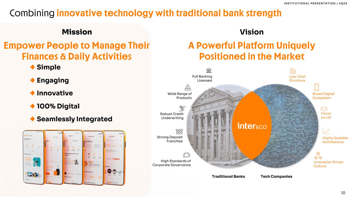 9 I N S T I T U T I O N A L P R E S E N T A T I O N | 4 Q 2 3 How Inter disrupted the market No Cashback No E-commerce Pushing Bad Products Credit Card Banking Account Trading & Investments Multiple Apps x Branch-Based Distribution High Distribution Costs Travel Costs To Costumers Long Waiting Lines Substantial Carbon Emissions Overcharged Customers Bank Statement Emission Fees Investments Fees Loans Rates Wire Transfers Legacy Technology The banking system before: obsolete and expensive banking proposition Inter: innovative and cost-effective banking proposition CO2 x % x Reaching Many Communities Digital Costumer Service Cloud Based Servers Environmentally Friendly Free Digital Account Commission Free Trading Loans Rates No Transfer Fees x Single App Cashback Rewards Strong E-commerce Client Centric Approach Payroll: no middleman (“pastinhas”) Insurance: no intermediaries Investments: no IFAs Shop: no MDRs -95% CO2 Emissions1 Note 1: In comparison to traditional banks business model. 100% Digital Fair Pricing Win-Win Model