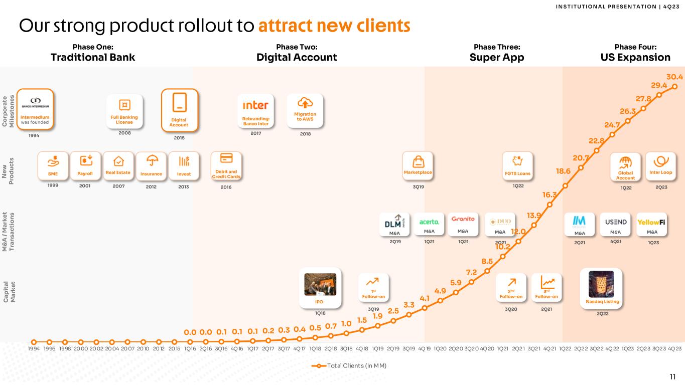 I N S T I T U T I O N A L P R E S E N T A T I O N | 4 Q 2 3 10 Combining innovative technology with traditional bank strength Mission Empower People to Manage Their Finances & Daily Activities Simple Engaging Innovative 100% Digital Seamlessly Integrated Vision A Powerful Platform Uniquely Positioned in the Market Traditional Banks Tech Companies Full Banking Licensed Wide Range of Products Strong Deposit Franchise Robust Credit Underwriting High Standards of Corporate Governance Low-Cost Structure Broad Digital Ecosystem Focus on UX Highly Scalable Architecture Innovation Driven Culture
