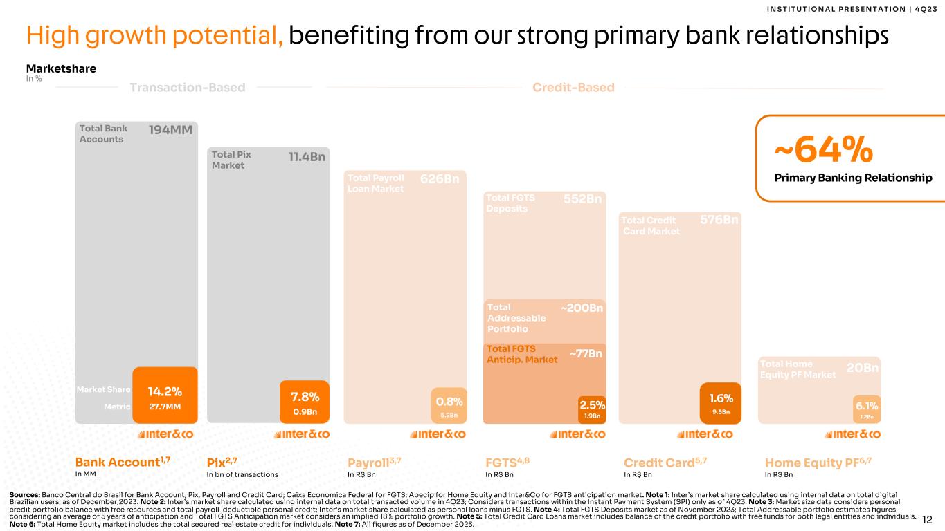 I N S T I T U T I O N A L P R E S E N T A T I O N | 4 Q 2 3 11 Our strong product rollout to attract new clients Phase One: Traditional Bank Phase Two: Digital Account Phase Three: Super App Phase Four: US Expansion M&A M&A M&A Intermedium was founded Digital Account Rebranding: Banco Inter Migration to AWSFull Banking License FGTS LoansDebit and Credit CardsInsuranceReal Estate InvestSME Payroll C or po ra te M ile st on es C ap it al M ar ke t N ew P ro du ct s M & A / M ar ke t Tr an sa ct io ns M&A M&A M&A Nasdaq ListingIPO M&A 1994 1999 2001 2007 2008 2012 2013 2015 2016 2017 2018 1Q18 2Q19 1Q21 1Q21 2Q21 2Q21 4Q21 1Q23 2Q22 1Q22 Marketplace 3Q19 Global Account 1Q22 3Q19 1st Follow-on 3Q20 2nd Follow-on 2Q21 3rd Follow-on Inter Loop 2Q23 0.0 0.0 0.1 0.1 0.1 0.2 0.3 0.4 0.5 0.7 1.0 1.5 1.9 2.5 3.3 4.1 4.9 5.9 7.2 8.5 10.2 12.0 13.9 16.3 18.6 20.7 22.8 24.7 26.3 27.8 29.4 30.4 - 5 10 15 20 25 30 1994 1996 1998 20 00 20 02 20 04 20 07 20 10 20 12 20 15 1Q16 2Q16 3Q16 4Q 16 1Q17 2Q17 3Q17 4Q 17 1Q18 2Q18 3Q18 4Q 18 1Q19 2Q19 3Q19 4Q 19 1Q20 2Q20 3Q20 4Q 20 1Q21 2Q21 3Q21 4Q 21 1Q22 2Q22 3Q22 4Q 22 1Q23 2Q23 3Q23 4Q 23 Total Clients (In MM)