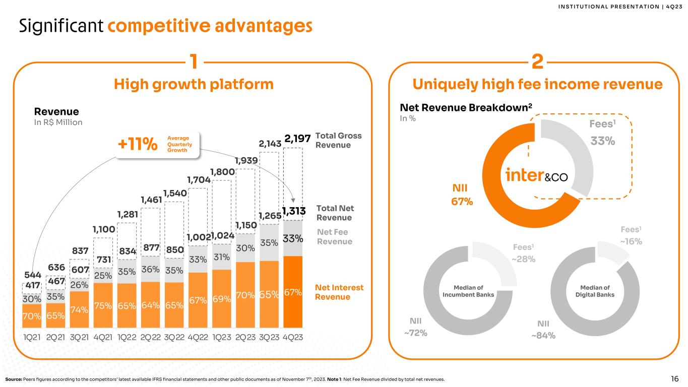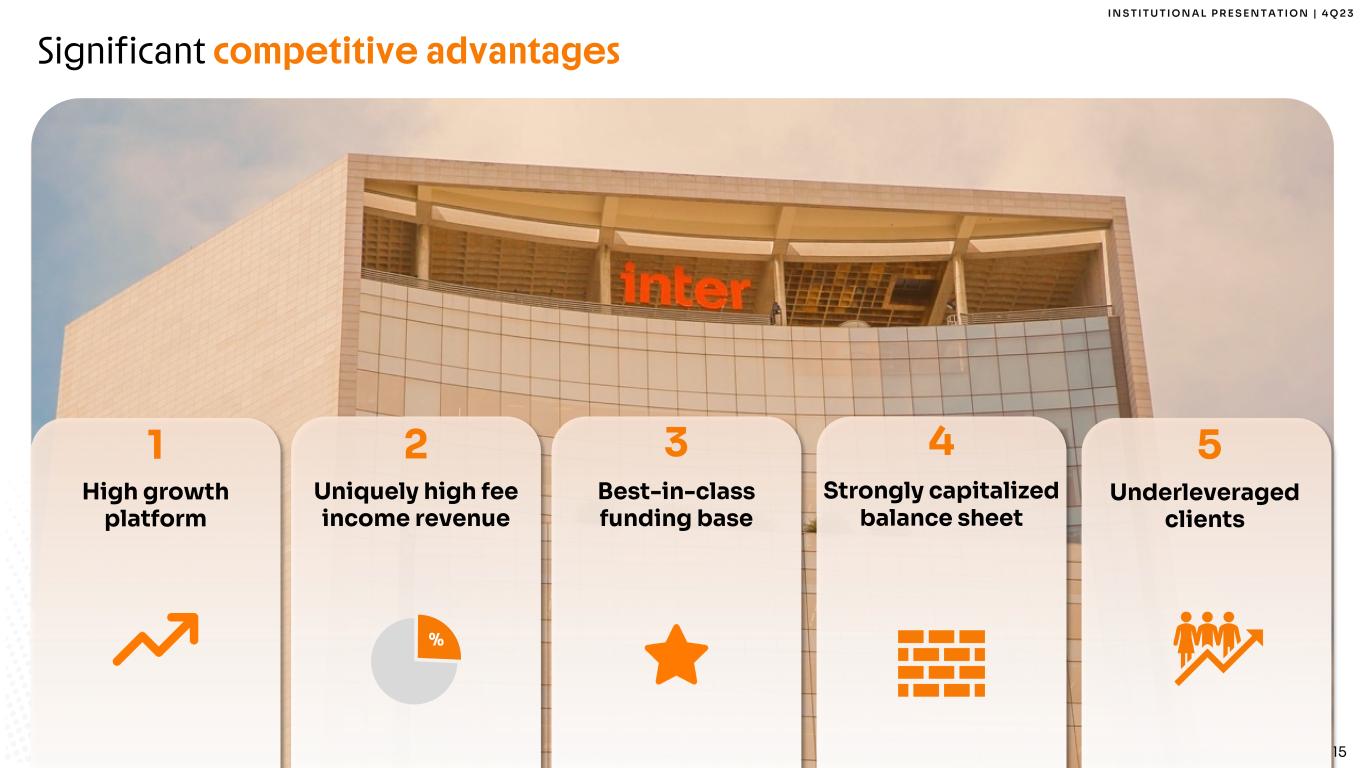 I N S T I T U T I O N A L P R E S E N T A T I O N | 4 Q 2 3 15 Significant competitive advantages Underleveraged clients High growth platform 1 % Uniquely high fee income revenue 2 Best-in-class funding base 3 Strongly capitalized balance sheet 4 5