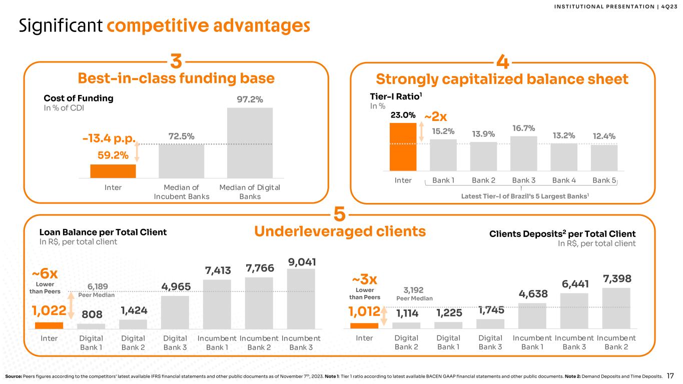 I N S T I T U T I O N A L P R E S E N T A T I O N | 4 Q 2 3 16 Significant competitive advantages High growth platform 1 70% 65% 74% 75% 65% 64% 65% 67% 69% 70% 65% 67% 30% 35% 26% 25% 35% 36% 35% 33% 31% 30% 35% 33% 417 467 607 731 834 877 850 1,002 1,024 1,150 1,265 1,313 544 636 837 1,100 1,281 1,461 1,540 1,704 1,800 1,939 2,143 2,197 0 5 0 10 0 0 15 0 0 2 0 0 1Q21 2Q21 3Q21 4Q21 1Q22 2Q22 3Q22 4Q22 1Q23 2Q23 3Q23 4Q23 Net Fee Revenue Net Interest Revenue Total Net Revenue Total Gross Revenue Uniquely high fee income revenue 2 67% 33% NII Fees1 Revenue In R$ Million Net Revenue Breakdown2 In % Median of Incumbent Banks Median of Digital Banks ~28% Fees1 ~72% NII ~84% NII ~16% Fees1 +11% Average Quarterly Growth Source: Peers figures according to the competitors’ latest available IFRS financial statements and other public documents as of November 7th, 2023. Note 1: Net Fee Revenue divided by total net revenues.