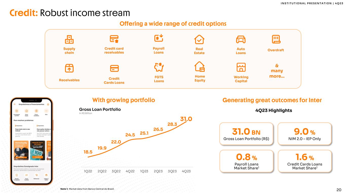 I N S T I T U T I O N A L P R E S E N T A T I O N | 4 Q 2 3 19 Banking & Spending: Building a strong client base Digital Account Deposits Debit & Credit Cards Pix Wire Transfers Digital Wallets & many more... Note 1: Total Brazilian market total payment volume of credit and debt cards according to Abecs. The base of our financial ecosystem A full licensed bank Attracting new costumers With a wide range of day-to- day services Payments To build strong engagement To explore our cross-selling capabilities Checking Account + 253 BN Cards + PIX TPV (R$) 4Q23 Quarters of relationship Cards + PIX TPV per Active Client In R$ Thousand, monthly 0 1 2 3 4 5 6 7 8 9 10 1 2 3 4 5 6 7 8 9 10 11 12 13 14 15 16 17 18 19 20 21 22 23 24 Th ou sa nd s 4Q23 1Q18 Banking & Spending