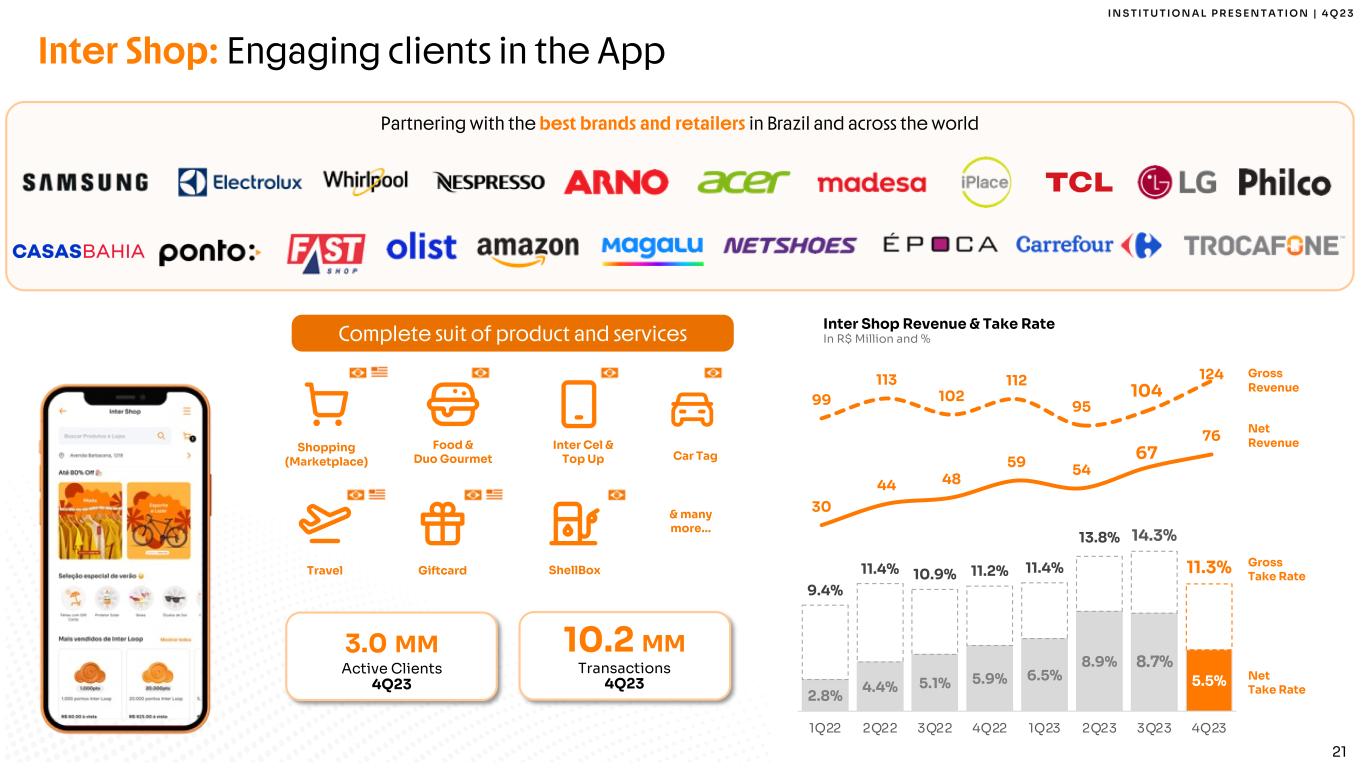 I N S T I T U T I O N A L P R E S E N T A T I O N | 4 Q 2 3 20 Credit: Robust income stream Note 1: Market data from Banco Central do Brasil. Supply chain Credit card receivables Receivables Credit Cards Loans Payroll Loans FGTS Loans Real Estate Home Equity Auto Loans Working Capital & many more... Overdraft Offering a wide range of credit options With growing portfolio Generating great outcomes for Inter 4Q23 Highlights 18.5 19.9 22.0 24.5 25.1 26.5 28.3 31.0 15.0 17.0 19.0 21.0 23.0 25.0 27.0 29.0 31.0 1Q22 2Q22 3Q22 4Q22 1Q23 2Q23 3Q23 4Q23 Gross Loan Portfolio In R$ Billion 31.0 BN Gross Loan Portfolio (R$) 9.0 % NIM 2.0 – IEP Only 0.8 % Payroll Loans Market Share1 1.6 % Credit Cards Loans Market Share1