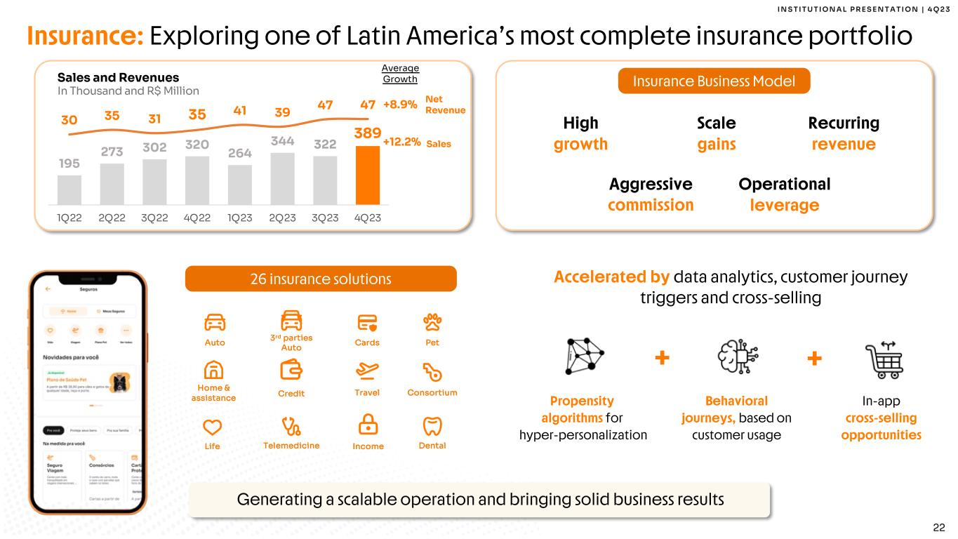 I N S T I T U T I O N A L P R E S E N T A T I O N | 4 Q 2 3 21 Inter Shop: Engaging clients in the App Inter Shop Revenue & Take Rate In R$ Million and % 30 44 48 59 54 67 76 99 113 102 112 95 104 124 2 5.0 4 5. 0 6 5. 0 8 5. 0 10 5. 0 12 5.0 Shopping (Marketplace) Giftcard Car Tag ShellBoxTravel Food & Duo Gourmet Inter Cel & Top Up & many more… 3.0 MM Active Clients 4Q23 10.2 MM Transactions 4Q23 Partnering with the best brands and retailers in Brazil and across the world 2.8% 4.4% 5.1% 5.9% 6.5% 8.9% 8.7% 5.5% 9.4% 11.4% 10.9% 11.2% 11.4% 13.8% 14.3% 11.3% 0. 0% 2. 0% 4. 0% 6. 0% 8. 0% 10. 0% 12. 0% 14. 0% 16. 0% 1Q22 2Q22 3Q22 4Q22 1Q23 2Q23 3Q23 4Q23 Net Take Rate Gross Take Rate Gross Revenue Net Revenue Complete suit of product and services