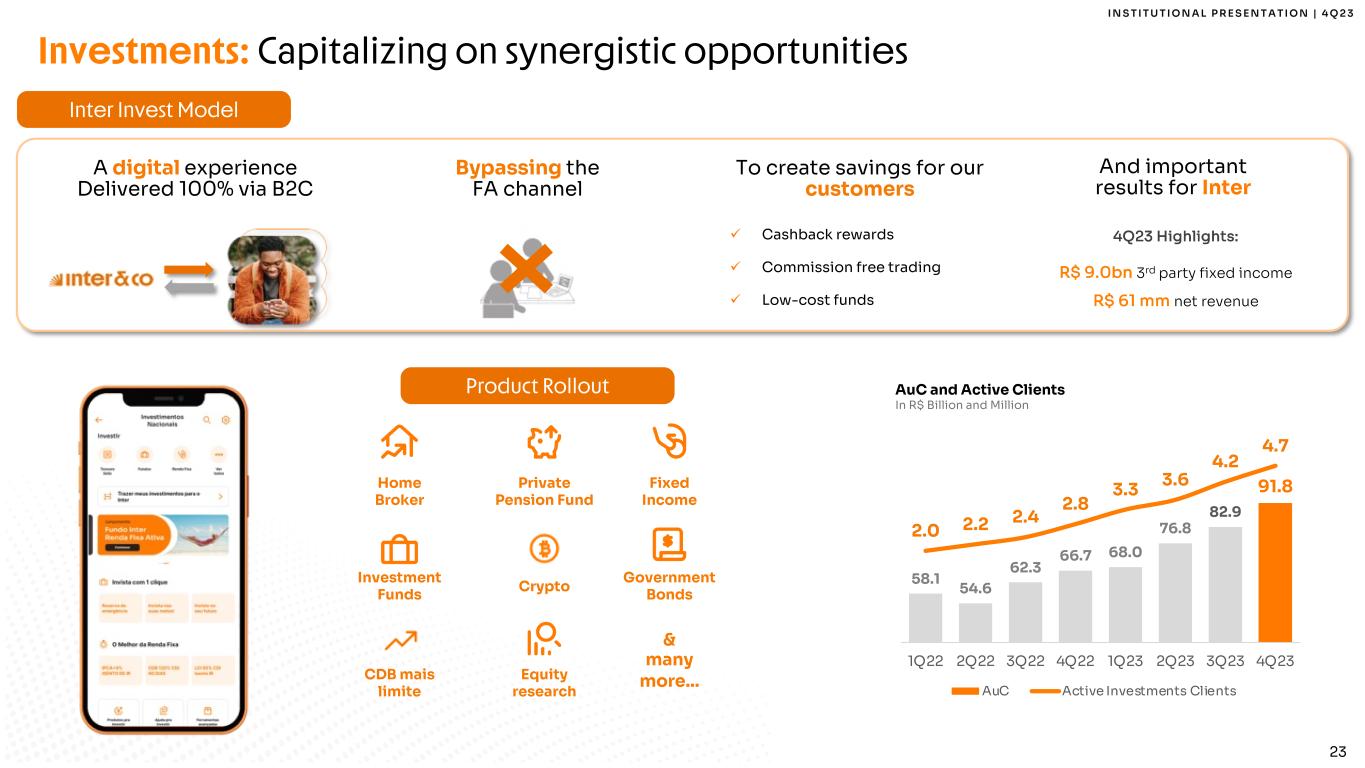 I N S T I T U T I O N A L P R E S E N T A T I O N | 4 Q 2 3 22 Insurance: Exploring one of Latin America’s most complete insurance portfolio Pet Life Travel Telemedicine CardsAuto Income Dental Home & assistance Consortium 3rd parties Auto Credit Generating a scalable operation and bringing solid business results Accelerated by data analytics, customer journey triggers and cross-selling + + Propensity algorithms for hyper-personalization Behavioral journeys, based on customer usage In-app cross-selling opportunities Operational leverage High growth Aggressive commission Scale gains Recurring revenue 195 273 302 320 264 344 322 389 30 35 31 35 41 39 47 47 -50 -30 -10 10 30 50 70 0 100 200 300 400 500 600 700 1Q22 2Q22 3Q22 4Q22 1Q23 2Q23 3Q23 4Q23 Average Growth +12.2% +8.9% Net Revenue Sales Sales and Revenues In Thousand and R$ Million Insurance Business Model 26 insurance solutions