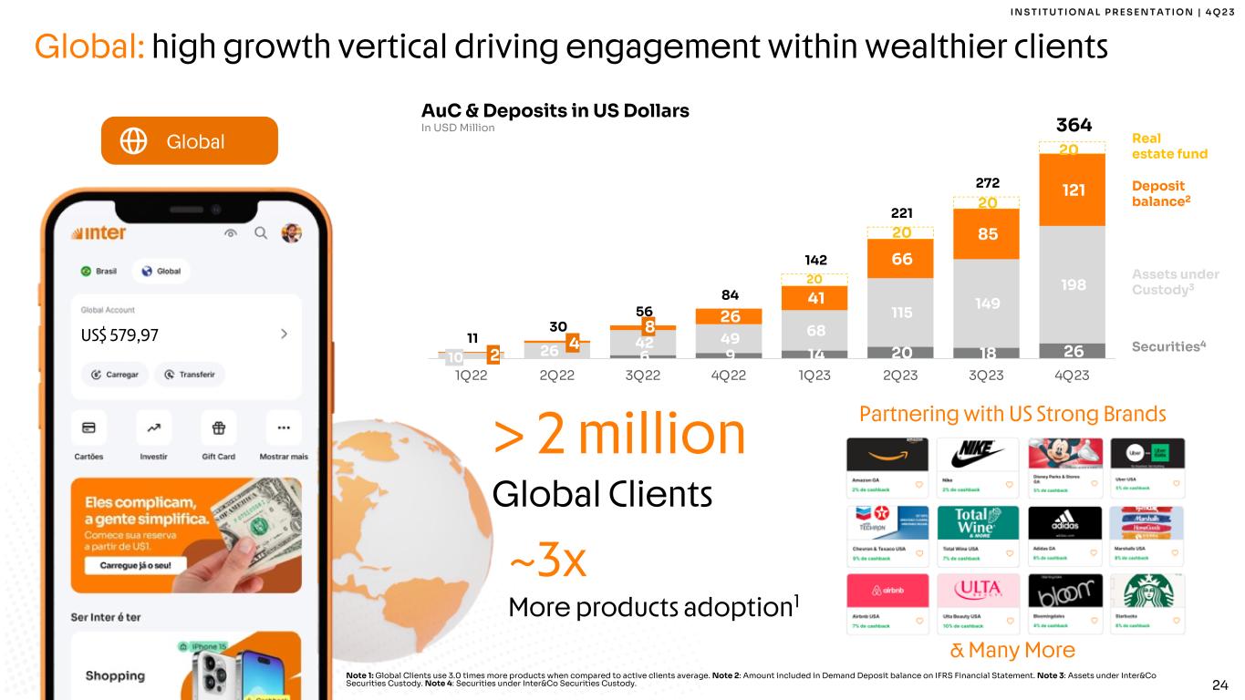 I N S T I T U T I O N A L P R E S E N T A T I O N | 4 Q 2 3 23 Bypassing the FA channel A digital experience Delivered 100% via B2C To create savings for our customers ü Cashback rewards ü Commission free trading ü Low-cost funds Investments: Capitalizing on synergistic opportunities 4Q23 Highlights: R$ 9.0bn 3rd party fixed income R$ 61 mm net revenue AuC and Active Clients In R$ Billion and Million 58.1 54.6 62.3 66.7 68.0 76.8 82.9 91.8 2.0 2.2 2.4 2.8 3.3 3.6 4.2 4.7 -1.0 0. 0 1.0 2. 0 3. 0 4. 0 5. 0 6. 0 40.0 50.0 60.0 70.0 80.0 90.0 100.0 110.0 120.0 1Q22 2Q22 3Q22 4Q22 1Q23 2Q23 3Q23 4Q23 AuC Active Investments Clients And important results for Inter & many more... Home Broker Private Pension Fund Fixed Income Investment Funds Crypto Government Bonds Equity research CDB mais limite Inter Invest Model Product Rollout