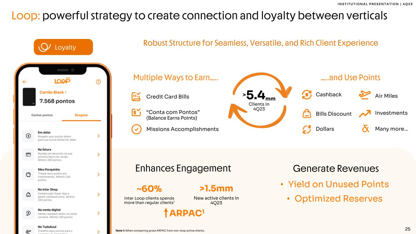 24 I N S T I T U T I O N A L P R E S E N T A T I O N | 4 Q 2 3 Global: high growth vertical driving engagement within wealthier clients > 2 million Global Clients ~3x More products adoption1 Note 1: Global Clients use 3.0 times more products when compared to active clients average. Note 2: Amount included in Demand Deposit balance on IFRS Financial Statement. Note 3: Assets under Inter&Co Securities Custody. Note 4: Securities under Inter&Co Securities Custody. 6 9 14 20 18 26 10 26 42 49 68 115 149 198 2 4 8 26 41 66 85 121 20 20 20 20 11 30 56 84 142 221 272 364 - 50 100 150 200 25 0 300 35 0 400 1Q22 2Q22 3Q22 4Q22 1Q23 2Q23 3Q23 4Q23 AuC & Deposits in US Dollars In USD Million Assets under Custody3 Deposit balance2 Securities4 Real estate fund US$ 579,97 Global Partnering with US Strong Brands & Many More