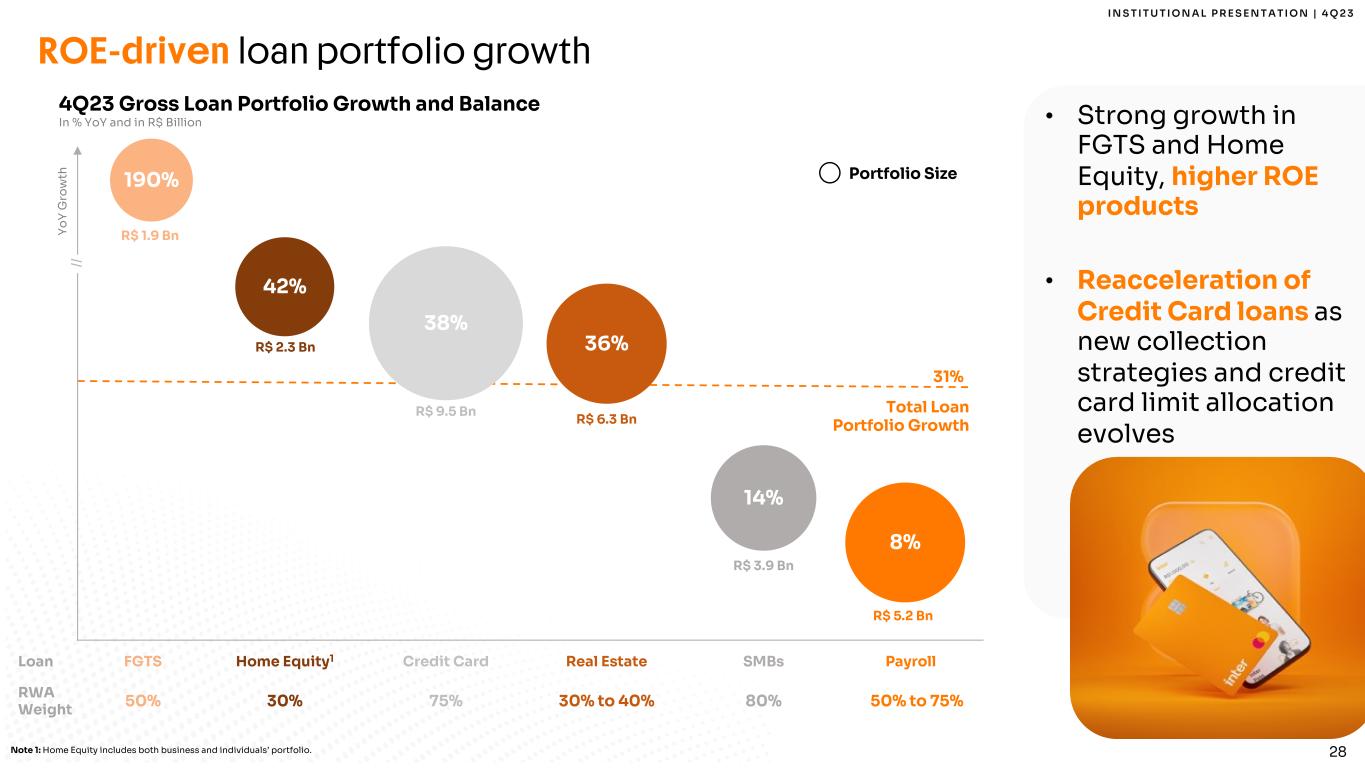 27 I N S T I T U T I O N A L P R E S E N T A T I O N | 4 Q 2 3 • +70% collateralized portfolio2 • Continuous focus towards repricing Accelerating loan growth while maintaining focus on higher ROE products Note 1: Home Equity includes both business and individuals’ portfolio. Note 2: Considering Real Estate, Payroll, FGTS, SMBs, Agribusiness, Home Equity as collateralized and Credit Cards as non-collateralized. Gross Loan Portfolio In R$ Billion 28% 26% 21% 19% 20% 19% 20% 20% 19% 20% 24% 14% 8% 6% 7% 7% 7% 7% 7% 7% 21% 19% 20% 20% 17% 20% 20% 20% 18% 17%3% 6% 3% 4% 5% 6% 6% 10% 18% 17% 14% 12% 14% 12% 12% 12% 12% 2% 4% 3% 2% 3% 3% 3% 3% 2% 16% 22% 27% 28% 30% 29% 29% 29% 31% 30% 17.2 22.7 29.8 22.7 23.8 25.1 27.0 29.8 2% 8% 4% 6% 5% 5% 4% 4% 4.8 8.8 17.5 24.5 31.0 24.0 25.1 26.5 28.3 31.0 0 .0 5 .0 10 .0 15 .0 2 0. 0 2 5. 0 3 0. 0 3 5. 0 2019 2020 2021 2022 2023 4Q22 1Q23 2Q23 3Q23 4Q23 +5% +10% +7% +5% +4% +14% +8% +36% +38% +26% +190% -33% % YoY +31% +42% Real Estate Personal SMBs Agribusiness Credit Card Total FGTS Anticip. of CC Receiv. Total Excl. Ant. of CC Receiv. Home Equity2
