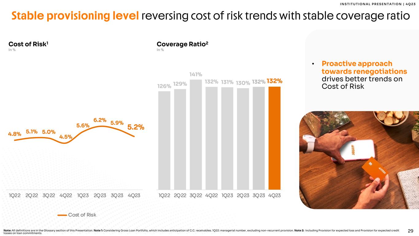 28 I N S T I T U T I O N A L P R E S E N T A T I O N | 4 Q 2 3 ROE-driven loan portfolio growth • Strong growth in FGTS and Home Equity, higher ROE products • Reacceleration of Credit Card loans as new collection strategies and credit card limit allocation evolves Note 1: Home Equity includes both business and individuals’ portfolio. 4Q23 Gross Loan Portfolio Growth and Balance In % YoY and in R$ Billion Total Loan Portfolio Growth 31% R$ 1.9 Bn 190% R$ 5.2 Bn 8% Yo Y G ro w th Portfolio Size // 36% R$ 6.3 Bn Real Estate 30% to 40% Payroll 50% to 75% R$ 9.5 Bn 38% Credit Card 75% R$ 3.9 Bn 14% SMBs 80% FGTS 50% 42% R$ 2.3 Bn Home Equity1 30%RWA Weight Loan