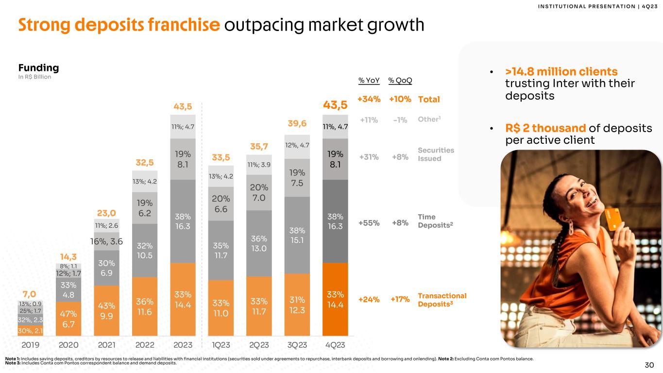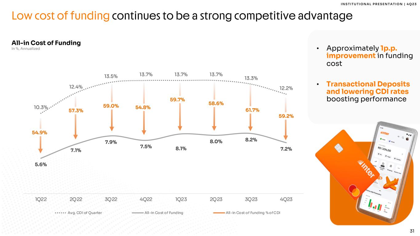 30 I N S T I T U T I O N A L P R E S E N T A T I O N | 4 Q 2 3 Strong deposits franchise outpacing market growth Note 1: Includes saving deposits, creditors by resources to release and liabilities with financial institutions (securities sold under agreements to repurchase, interbank deposits and borrowing and onlending). Note 2: Excluding Conta com Pontos balance. Note 3: Includes Conta com Pontos correspondent balance and demand deposits. Funding In R$ Billion 30%, 2.1 47% 6.7 43% 9.9 36% 11.6 33% 14.4 33% 11.0 33% 11.7 31% 12.3 33% 14.4 32%, 2.3 33% 4.8 30% 6.9 32% 10.5 38% 16.3 35% 11.7 36% 13.0 38% 15.1 38% 16.3 25%; 1.7 12%; 1.7 16%, 3.6 19% 6.2 19% 8.1 20% 6.6 20% 7.0 19% 7.5 19% 8.1 13%; 0.9 8%; 1.1 11%; 2.6 13%; 4.2 11%; 4.7 13%; 4.2 11%; 3.9 12%, 4.7 11%, 4.7 7,0 14,3 23,0 32,5 43,5 33,5 35,7 39,6 43,5 2019 2020 2021 2022 2023 1Q23 2Q23 3Q23 4Q23 Time Deposits2 Securities Issued Other1 Transactional Deposits3 Total +11% % YoY % QoQ -1% +31% +8% +55% +8% +24% +17% +34% +10% • >14.8 million clients trusting Inter with their deposits • R$ 2 thousand of deposits per active client