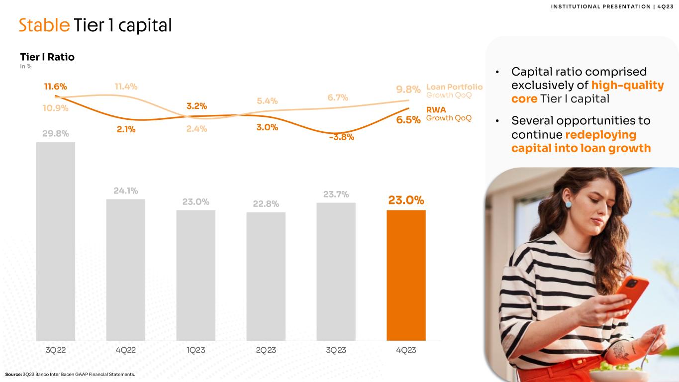 32 I N S T I T U T I O N A L P R E S E N T A T I O N | 4 Q 2 3 32 Stable Tier 1 capital 29.8% 24.1% 23.0% 22.8% 23.7% 23.0% 3Q22 4Q22 1Q23 2Q23 3Q23 4Q23 Tier I Ratio In % Source: 3Q23 Banco Inter Bacen GAAP Financial Statements. • Capital ratio comprised exclusively of high-quality core Tier I capital • Several opportunities to continue redeploying capital into loan growth 11.6% 2.1% 3.2% 3.0% -3.8% 6.5% 10.9% 11.4% 2.4% 5.4% 6.7% 9.8% -5% 0% 5% 10% 15% Loan Portfolio Growth QoQ RWA Growth QoQ