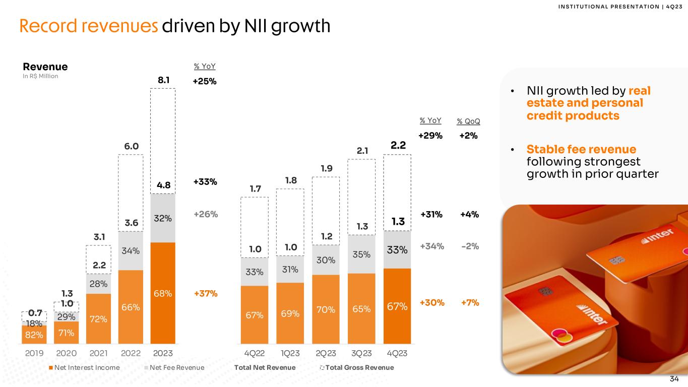 34 I N S T I T U T I O N A L P R E S E N T A T I O N | 4 Q 2 3 70% 65% 74% 75% 65% 64% 65% 67% 69% 70% 65% 67%30% 35% 26% 25% 35% 36% 35% 33% 31% 30% 35% 33% 417 467 607 731 834 877 850 1,002 1,024 1,150 1,265 1,313 544 636 837 1,100 1,281 1,461 1,540 1,704 1,800 1,939 2,143 2,197 0 5 0 10 0 0 15 0 0 2 0 0 1Q21 2Q21 3Q21 4Q21 1Q22 2Q22 3Q22 4Q22 1Q23 2Q23 3Q23 4Q23 Net Interest Income Net Fee Revenue Total Net Revenue Total Gross Revenue 67% 69% 70% 65% 67% 33% 31% 30% 35% 33%1.0 1.0 1.2 1.3 1.3 1.7 1.8 1.9 2.1 2.2 - 0 .5 1 .0 1 .5 2 .0 2 .5 4Q22 1Q23 2Q23 3Q23 4Q23 % YoY +29% +30% +31% +34% % QoQ +2% +7% +4% -2% Record revenues driven by NII growth • NII growth led by real estate and personal credit products • Stable fee revenue following strongest growth in prior quarter 82% 71% 72% 66% 68% 18% 29% 28% 34% 32% 0.7 1.0 2.2 3.6 4.8 1.3 3.1 6.0 8.1 - 1 .0 0 2 .0 0 3 .0 0 4 .0 0 5 .0 0 6 .0 0 7 .0 0 8 .0 0 9 .0 0 2019 2020 2021 2022 2023 +37% +26% Revenue In R$ Million % YoY +25% +33%