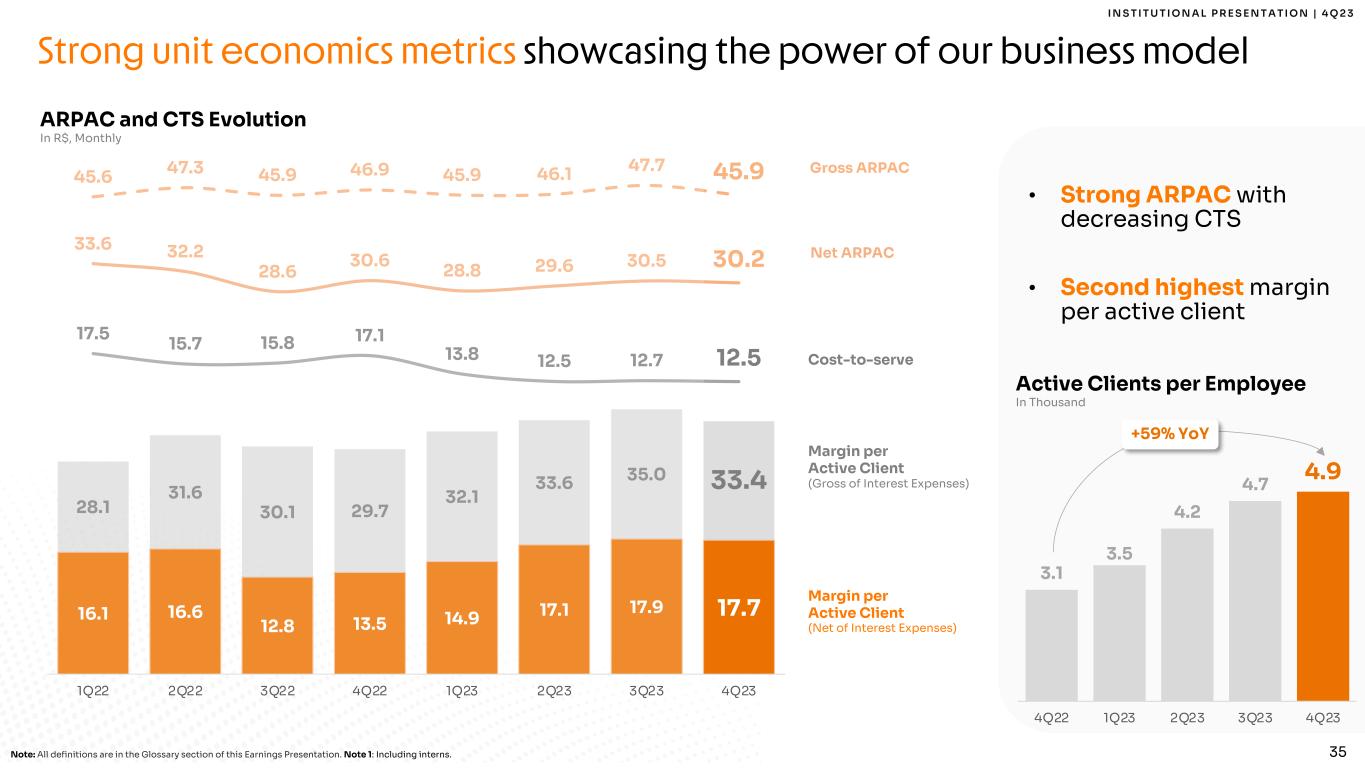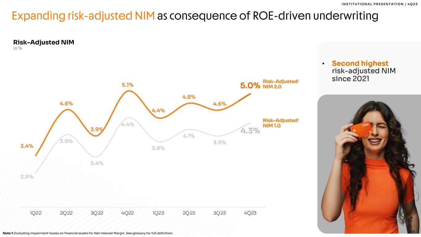 35 I N S T I T U T I O N A L P R E S E N T A T I O N | 4 Q 2 3 Strong unit economics metrics showcasing the power of our business model ARPAC and CTS Evolution In R$, Monthly 16.1 16.6 12.8 13.5 14.9 17.1 17.9 17.7 28.1 31.6 30.1 29.7 32.1 33.6 35.0 33.4 45.6 47.3 45.9 46.9 45.9 46.1 47.7 45.9 33.6 32.2 28.6 30.6 28.8 29.6 30.5 30.2 17.5 15.7 15.8 17.1 13.8 12.5 12.7 12.5 1Q22 2Q22 3Q22 4Q22 1Q23 2Q23 3Q23 4Q23 Cost-to-serve Margin per Active Client (Net of Interest Expenses) Margin per Active Client (Gross of Interest Expenses) Net ARPAC Gross ARPAC • Strong ARPAC with decreasing CTS • Second highest margin per active client Note: All definitions are in the Glossary section of this Earnings Presentation. Note 1: Including interns. 3.1 3.5 4.2 4.7 4.9 1.0 1.5 2. 0 2. 5 3. 0 3. 5 4. 0 4. 5 5. 0 5. 5 4Q22 1Q23 2Q23 3Q23 4Q23 Active Clients per Employee In Thousand +59% YoY