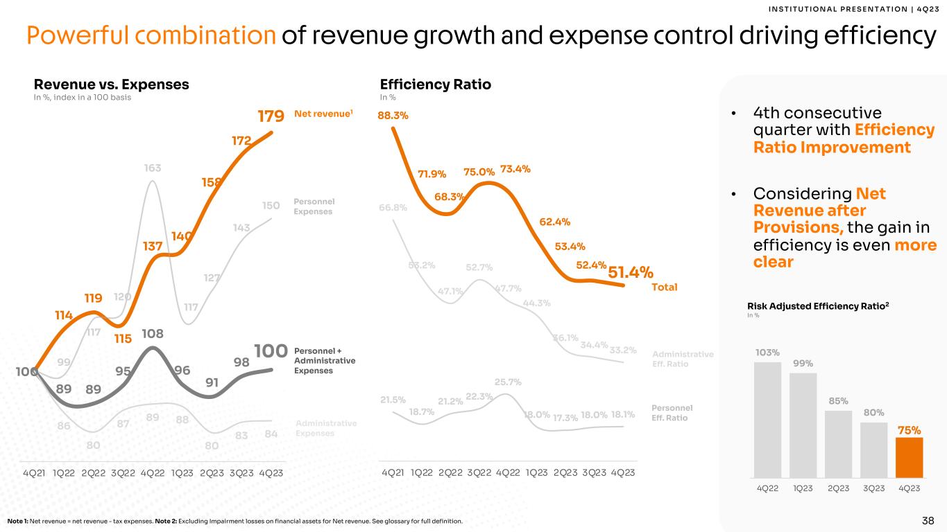 37 I N S T I T U T I O N A L P R E S E N T A T I O N | 4 Q 2 3 % YoY -8% -10% +1% -23% % QoQ +2% +2% -5% +39% Data processing5 Advertising & marketing Other3 M&A2 Impressive results on expenses, which continues to be a top priority in 2024 Total Expenses -3% +3% Expenses Excl. M&A & SBC -27% +1% D&A +10% +9% Personnel4 Share-based comp.2 Expenses Breakdown1 In R$ Million Strong opportunity to continue delivering operating leverage Note 1: IFRS Financial Statements lines: “Personnel expenses”, “Depreciation and Amortization”, “Administrative Expenses”. Note 2: Share-based and M&A Expenses are included in Personnel Expenses in the Income Statement. Note 3: Others = third party services; rent, condominium fee and property maintenance; provisions for contingencies and Financial System services. Note 4: Personnel Expenses excluding Share-based and M&A Expenses. Salaries and benefits (including Board). Note 5: Data processing and information technology. 178 209 200 190 180 40 20 21 22 30 56 38 41 41 41 189 156 170 191 207 171 157 127 151 154 634 579 559 594 613 43 6 10 8 8 8 10 6 11 6 685 596 575 614 628 - 50 5 0 15 0 2 50 3 50 4 50 5 50 6 50 7 50 4Q22 1Q23 2Q23 3Q23 4Q23 -80% -0% -31% -50% 696 746 138 94 164 160 639 724 660 588 2,298 2,313 32 33 2,392 2,379 0 5 0 10 0 0 15 0 0 2 0 0 2 50 0 3 0 0 2022 2023 % YoY -1% -11% +7% -32% -1% -2% +13% -46% +4%