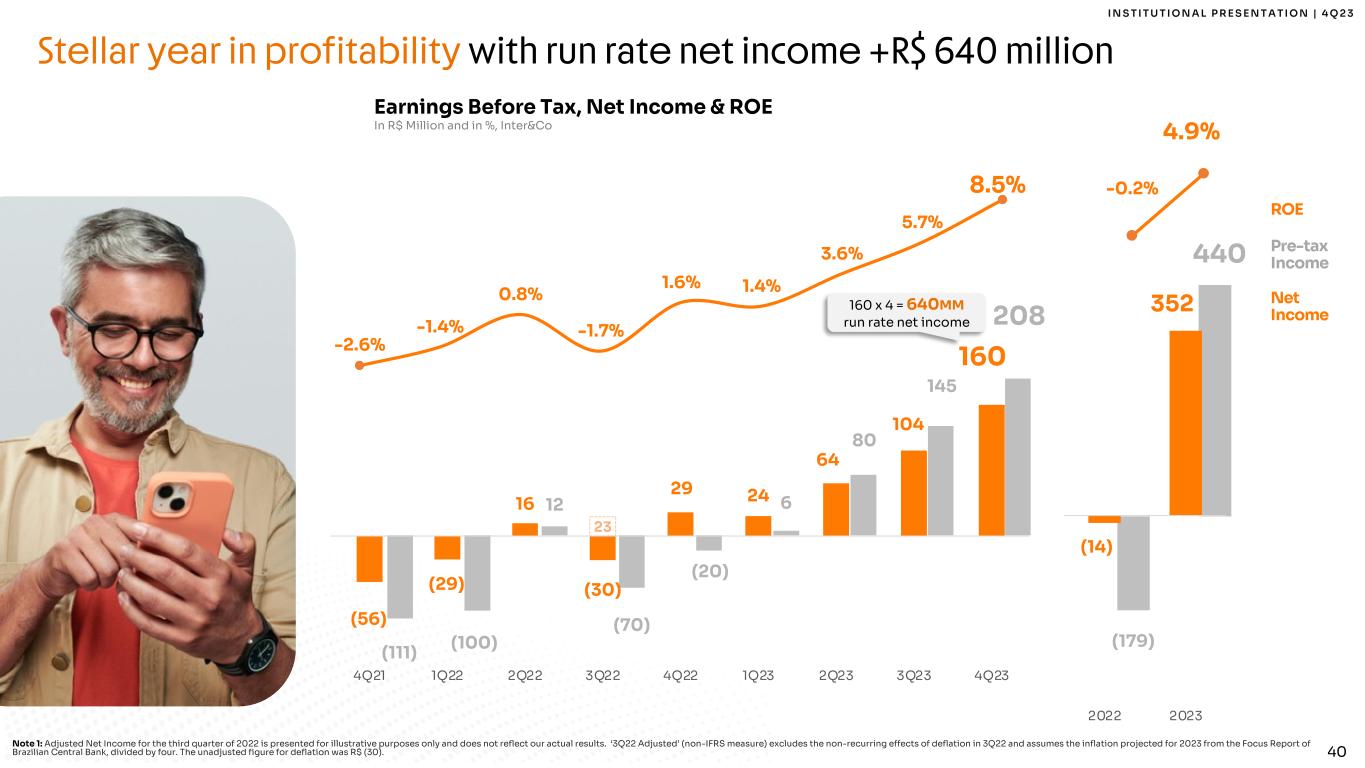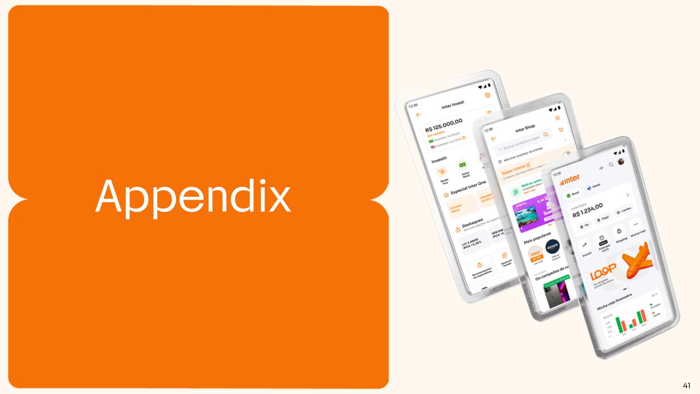 40 I N S T I T U T I O N A L P R E S E N T A T I O N | 4 Q 2 3 (179) 440 -350 -250 -150 -50 50 150 250 350 450 550 (14) 352 -350 -250 -150 -50 50 150 250 350 450 550 2022 2023 Note 1: Adjusted Net Income for the third quarter of 2022 is presented for illustrative purposes only and does not reflect our actual results. ‘3Q22 Adjusted’ (non-IFRS measure) excludes the non-recurring effects of deflation in 3Q22 and assumes the inflation projected for 2023 from the Focus Report of Brazilian Central Bank, divided by four. The unadjusted figure for deflation was R$ (30). Earnings Before Tax, Net Income & ROE In R$ Million and in %, Inter&Co Pre-tax Income Net Income ROE Stellar year in profitability with run rate net income +R$ 640 million -0.2% 4.9% -10.0% -8.0% -6.0% -4.0% -2.0% 0.0% 2.0% 4.0% 6.0% 8.0% 10.0% (111) (100) 12 (70) (20) 6 80 145 208 -200 -100 0 100 200 300 400 (56) (29) 16 (30) 29 24 64 104 160 23 -150 -50 50 150 250 350 4Q21 1Q22 2Q22 3Q22 4Q22 1Q23 2Q23 3Q23 4Q23 -2.6% -1.4% 0.8% -1.7% 1.6% 1.4% 3.6% 5.7% 8.5% -4.0% -2.0% 0.0% 2.0% 4.0% 6.0% 8.0% 10.0% 160 x 4 = 640MM run rate net income