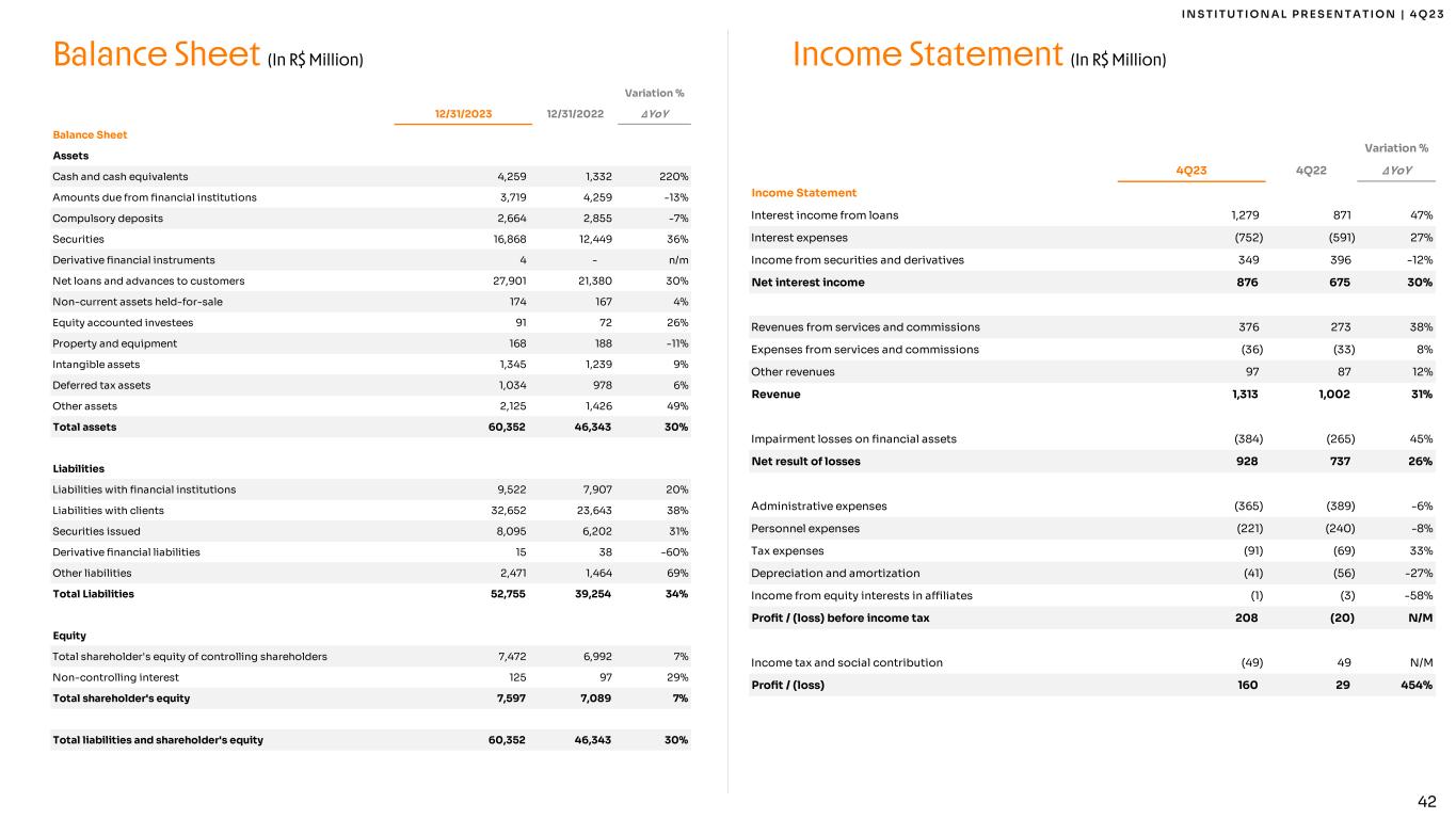 42 I N S T I T U T I O N A L P R E S E N T A T I O N | 4 Q 2 3 Balance Sheet (In R$ Million) Income Statement (In R$ Million) Variation % 4Q23 4Q22 ∆YoY Income Statement Interest income from loans 1,279 871 47% Interest expenses (752) (591) 27% Income from securities and derivatives 349 396 -12% Net interest income 876 675 30% Revenues from services and commissions 376 273 38% Expenses from services and commissions (36) (33) 8% Other revenues 97 87 12% Revenue 1,313 1,002 31% Impairment losses on financial assets (384) (265) 45% Net result of losses 928 737 26% Administrative expenses (365) (389) -6% Personnel expenses (221) (240) -8% Tax expenses (91) (69) 33% Depreciation and amortization (41) (56) -27% Income from equity interests in affiliates (1) (3) -58% Profit / (loss) before income tax 208 (20) N/M Income tax and social contribution (49) 49 N/M Profit / (loss) 160 29 454% 4Q23 4Q22 Variation % 12/31/2023 12/31/2022 ∆YoY Balance Sheet Assets Cash and cash equivalents 4,259 1,332 220% Amounts due from financial institutions 3,719 4,259 -13% Compulsory deposits 2,664 2,855 -7% Securities 16,868 12,449 36% Derivative financial instruments 4 - n/m Net loans and advances to customers 27,901 21,380 30% Non-current assets held-for-sale 174 167 4% Equity accounted investees 91 72 26% Property and equipment 168 188 -11% Intangible assets 1,345 1,239 9% Deferred tax assets 1,034 978 6% Other assets 2,125 1,426 49% Total assets 60,352 46,343 30% Liabilities Liabilities with financial institutions 9,522 7,907 20% Liabilities with clients 32,652 23,643 38% Securities issued 8,095 6,202 31% Derivative financial liabilities 15 38 -60% Other liabilities 2,471 1,464 69% Total Liabilities 52,755 39,254 34% Equity Total shareholder's equity of controlling shareholders 7,472 6,992 7% Non-controlling interest 125 97 29% Total shareholder's equity 7,597 7,089 7% Total liabilities and shareholder's equity 60,352 46,343 30%