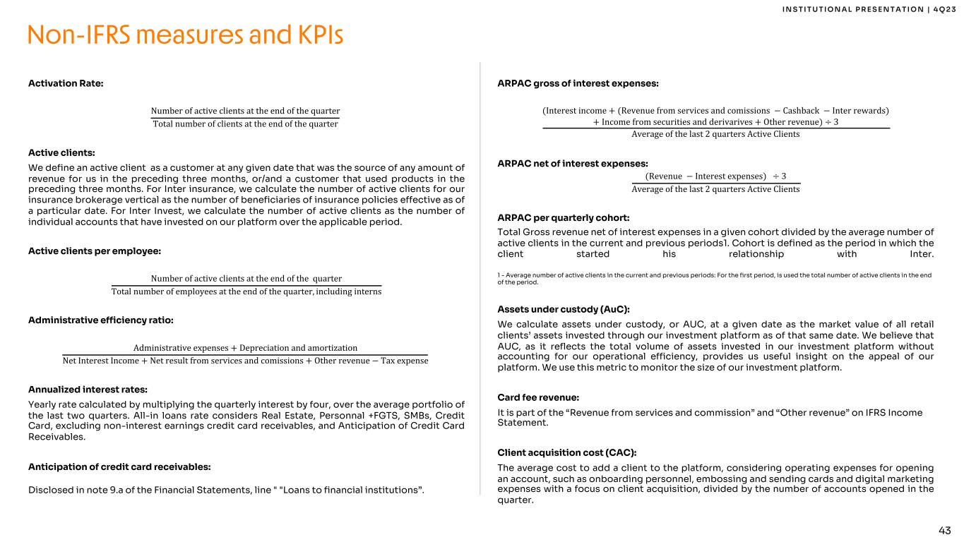 43 I N S T I T U T I O N A L P R E S E N T A T I O N | 4 Q 2 3 Non-IFRS measures and KPIs Activation Rate: Number of active clients at the end of the quarter Total number of clients at the end of the quarter Active clients: We define an active client as a customer at any given date that was the source of any amount of revenue for us in the preceding three months, or/and a customer that used products in the preceding three months. For Inter insurance, we calculate the number of active clients for our insurance brokerage vertical as the number of beneficiaries of insurance policies effective as of a particular date. For Inter Invest, we calculate the number of active clients as the number of individual accounts that have invested on our platform over the applicable period. Active clients per employee: Number of active clients at the end of the quarter Total number of employees at the end of the quarter, including interns Administrative efficiency ratio: Administrative expenses + Depreciation and amortization Net Interest Income + Net result from services and comissions + Other revenue − Tax expense Annualized interest rates: Yearly rate calculated by multiplying the quarterly interest by four, over the average portfolio of the last two quarters. All-in loans rate considers Real Estate, Personnal +FGTS, SMBs, Credit Card, excluding non-interest earnings credit card receivables, and Anticipation of Credit Card Receivables. Anticipation of credit card receivables: Disclosed in note 9.a of the Financial Statements, line " "Loans to financial institutions”. ARPAC gross of interest expenses: (Interest income + (Revenue from services and comissions − Cashback − Inter rewards) + Income from securities and derivarives + Other revenue) ÷ 3 Average of the last 2 quarters Active Clients ARPAC net of interest expenses: (Revenue − Interest expenses) ÷ 3 Average of the last 2 quarters Active Clients ARPAC per quarterly cohort: Total Gross revenue net of interest expenses in a given cohort divided by the average number of active clients in the current and previous periods1. Cohort is defined as the period in which the client started his relationship with Inter. 1 - Average number of active clients in the current and previous periods: For the first period, is used the total number of active clients in the end of the period. Assets under custody (AuC): We calculate assets under custody, or AUC, at a given date as the market value of all retail clients’ assets invested through our investment platform as of that same date. We believe that AUC, as it reflects the total volume of assets invested in our investment platform without accounting for our operational efficiency, provides us useful insight on the appeal of our platform. We use this metric to monitor the size of our investment platform. Card fee revenue: It is part of the “Revenue from services and commission” and “Other revenue” on IFRS Income Statement. Client acquisition cost (CAC): The average cost to add a client to the platform, considering operating expenses for opening an account, such as onboarding personnel, embossing and sending cards and digital marketing expenses with a focus on client acquisition, divided by the number of accounts opened in the quarter.