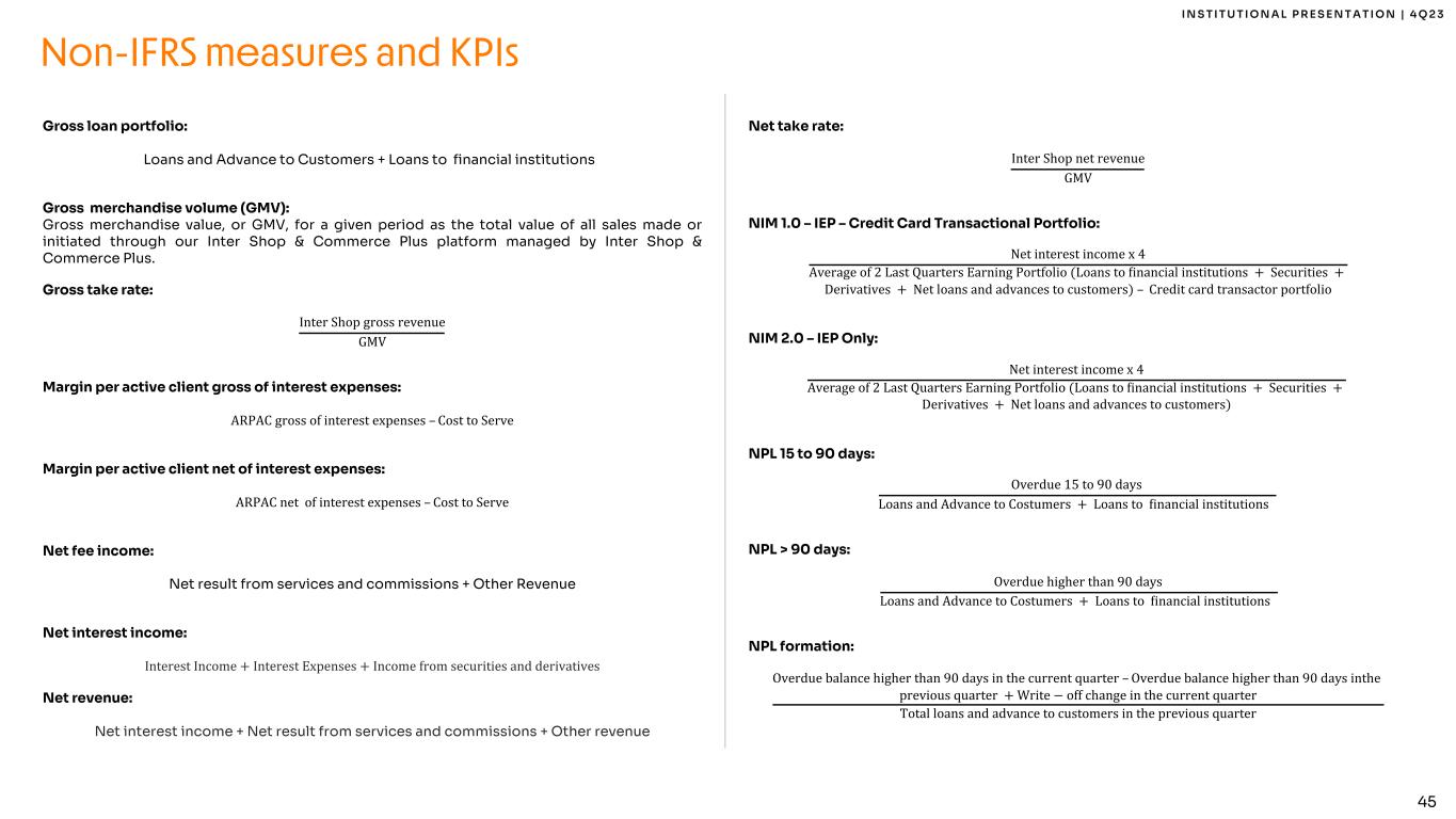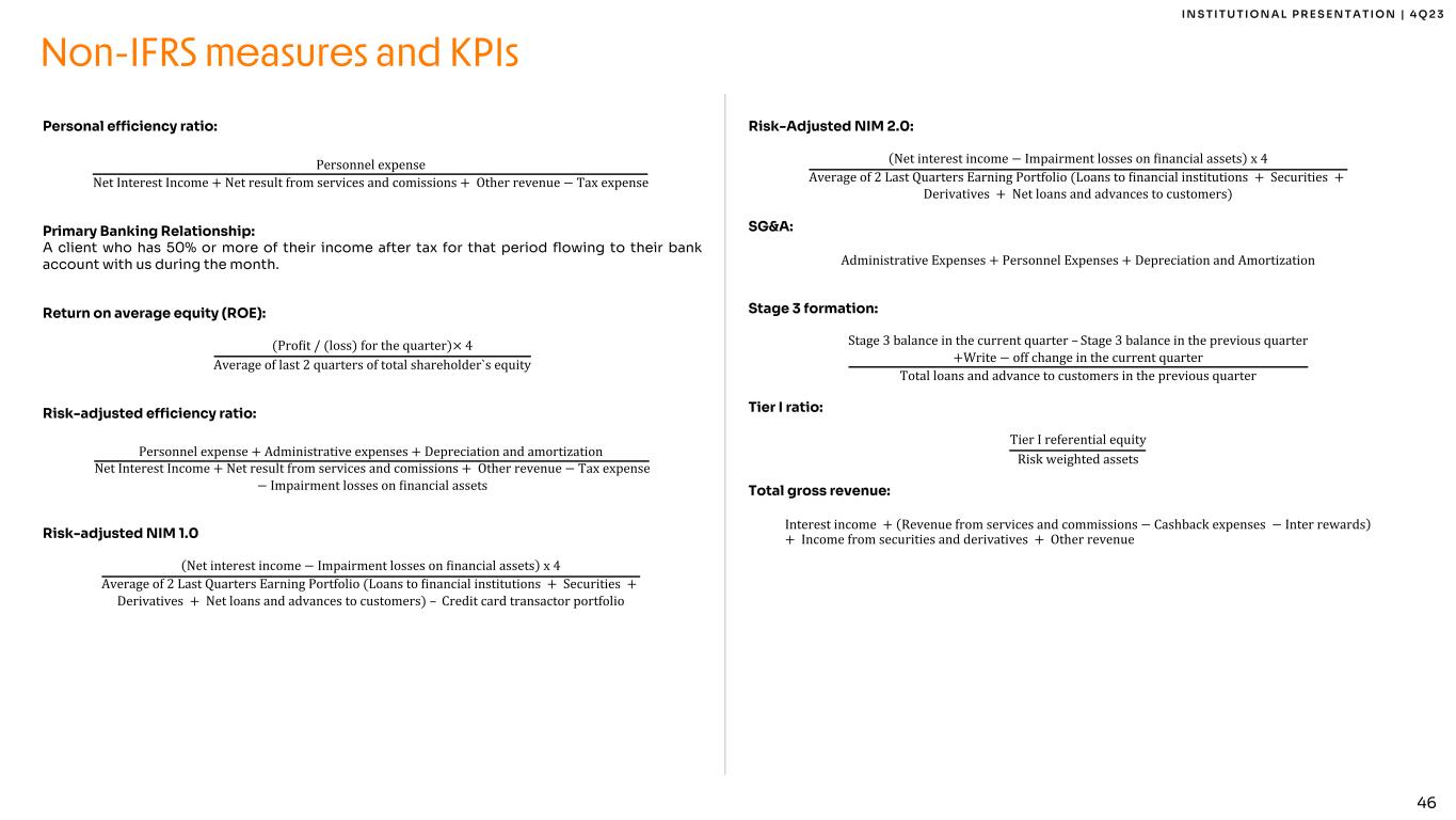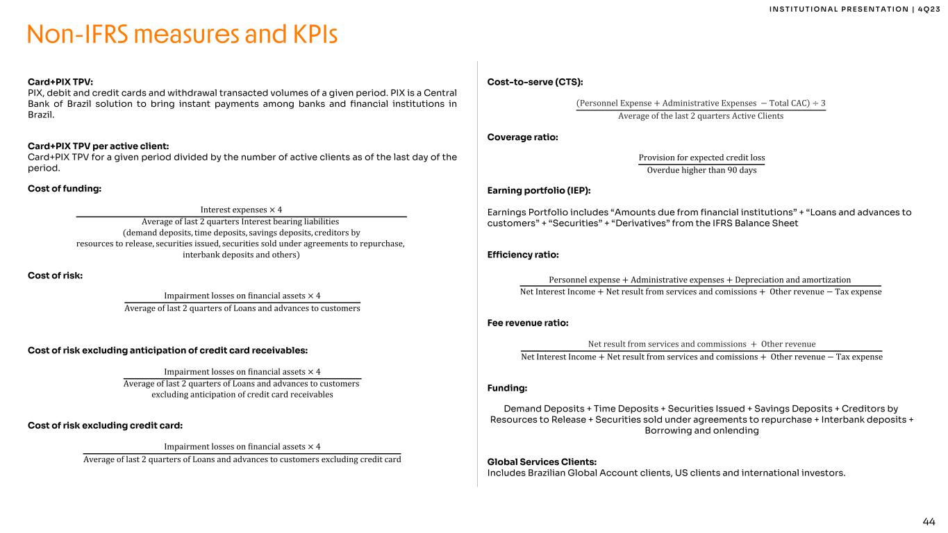 44 I N S T I T U T I O N A L P R E S E N T A T I O N | 4 Q 2 3 Card+PIX TPV: PIX, debit and credit cards and withdrawal transacted volumes of a given period. PIX is a Central Bank of Brazil solution to bring instant payments among banks and financial institutions in Brazil. Card+PIX TPV per active client: Card+PIX TPV for a given period divided by the number of active clients as of the last day of the period. Cost of funding: Interest expenses × 4 Average of last 2 quarters Interest bearing liabilities (demand deposits, time deposits, savings deposits, creditors by resources to release, securities issued, securities sold under agreements to repurchase, interbank deposits and others) Cost of risk: Impairment losses on Minancial assets × 4 Average of last 2 quarters of Loans and advances to customers Cost of risk excluding anticipation of credit card receivables: Impairment losses on Minancial assets × 4 Average of last 2 quarters of Loans and advances to customers excluding anticipation of credit card receivables Cost of risk excluding credit card: Impairment losses on Minancial assets × 4 Average of last 2 quarters of Loans and advances to customers excluding credit card Cost-to-serve (CTS): Personnel Expense + Administrative Expenses − Total CAC ÷ 3 Average of the last 2 quarters Active Clients Coverage ratio: Provision for expected credit loss Overdue higher than 90 days Earning portfolio (IEP): Earnings Portfolio includes “Amounts due from financial institutions” + “Loans and advances to customers” + “Securities” + “Derivatives” from the IFRS Balance Sheet Efficiency ratio: Personnel expense + Administrative expenses + Depreciation and amortization Net Interest Income + Net result from services and comissions + Other revenue − Tax expense Fee revenue ratio: Net result from services and commissions + Other revenue Net Interest Income + Net result from services and comissions + Other revenue − Tax expense Funding: Demand Deposits + Time Deposits + Securities Issued + Savings Deposits + Creditors by Resources to Release + Securities sold under agreements to repurchase + Interbank deposits + Borrowing and onlending Global Services Clients: Includes Brazilian Global Account clients, US clients and international investors. Non-IFRS measures and KPIs