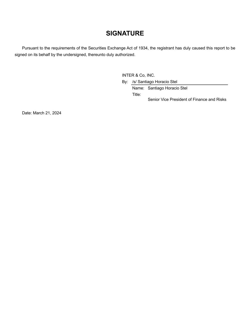 SIGNATURE Pursuant to the requirements of the Securities Exchange Act of 1934, the registrant has duly caused this report to be signed on its behalf by the undersigned, thereunto duly authorized. INTER & Co, INC. By: /s/ Santiago Horacio Stel Name: Santiago Horacio Stel Title: Senior Vice President of Finance and Risks Date: March 21, 2024