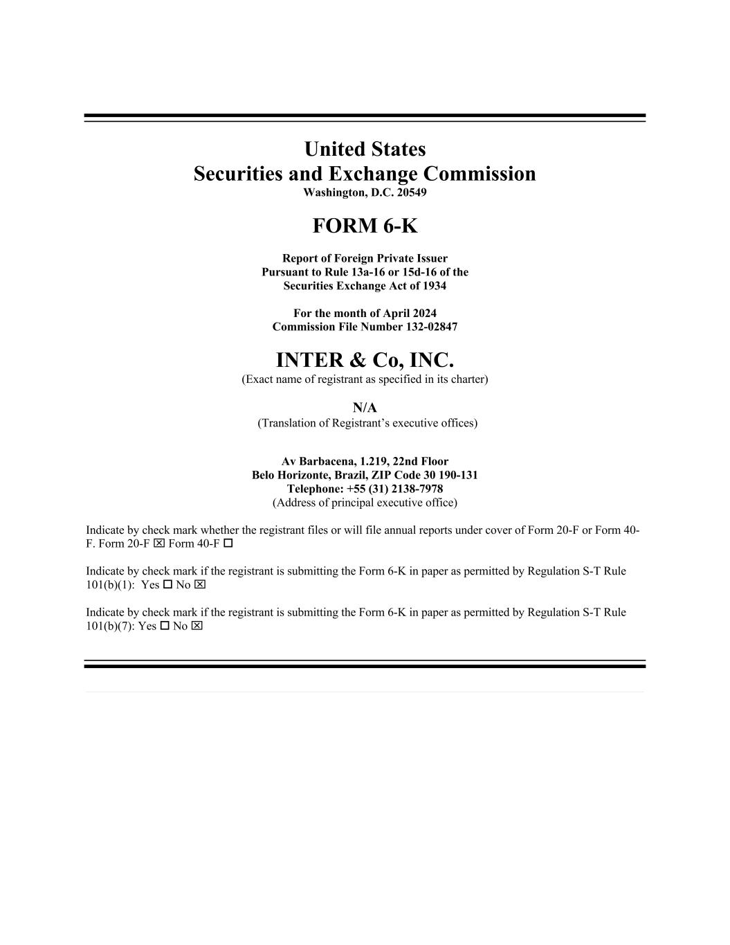 United States Securities and Exchange Commission Washington, D.C. 20549 FORM 6-K Report of Foreign Private Issuer Pursuant to Rule 13a-16 or 15d-16 of the Securities Exchange Act of 1934 For the month of April 2024 Commission File Number 132-02847 INTER & Co, INC. (Exact name of registrant as specified in its charter) N/A (Translation of Registrant’s executive offices) Av Barbacena, 1.219, 22nd Floor Belo Horizonte, Brazil, ZIP Code 30 190-131 Telephone: +55 (31) 2138-7978 (Address of principal executive office) Indicate by check mark whether the registrant files or will file annual reports under cover of Form 20-F or Form 40- F. Form 20-F x Form 40-F o Indicate by check mark if the registrant is submitting the Form 6-K in paper as permitted by Regulation S-T Rule 101(b)(1): Yes o No x Indicate by check mark if the registrant is submitting the Form 6-K in paper as permitted by Regulation S-T Rule 101(b)(7): Yes o No x