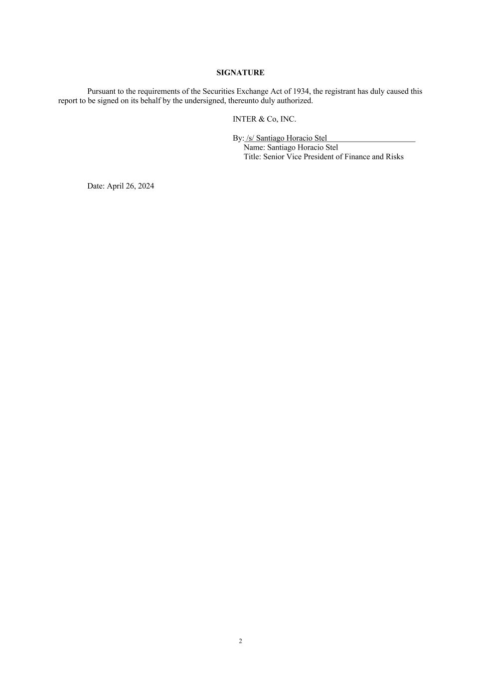 2 SIGNATURE Pursuant to the requirements of the Securities Exchange Act of 1934, the registrant has duly caused this report to be signed on its behalf by the undersigned, thereunto duly authorized. INTER & Co, INC. By: /s/ Santiago Horacio Stel Name: Santiago Horacio Stel Title: Senior Vice President of Finance and Risks Date: April 26, 2024