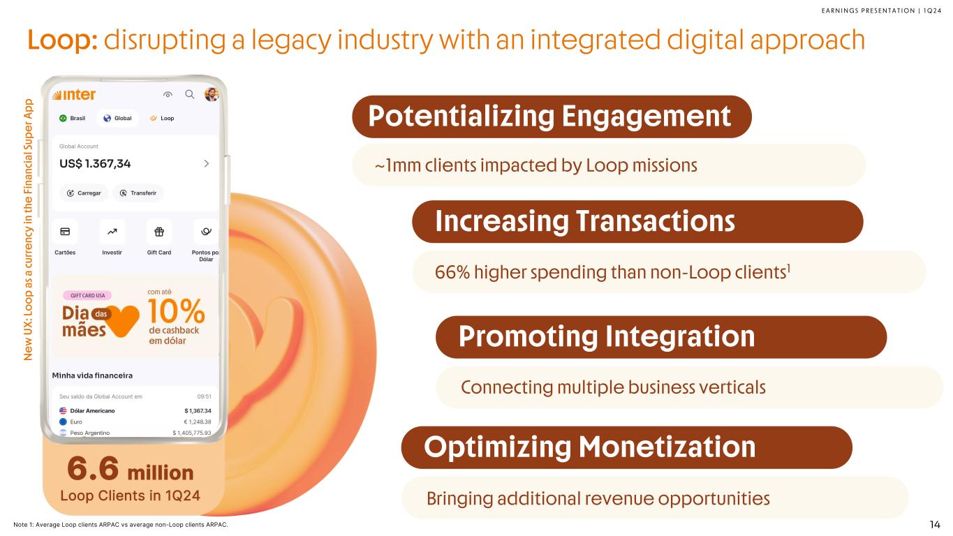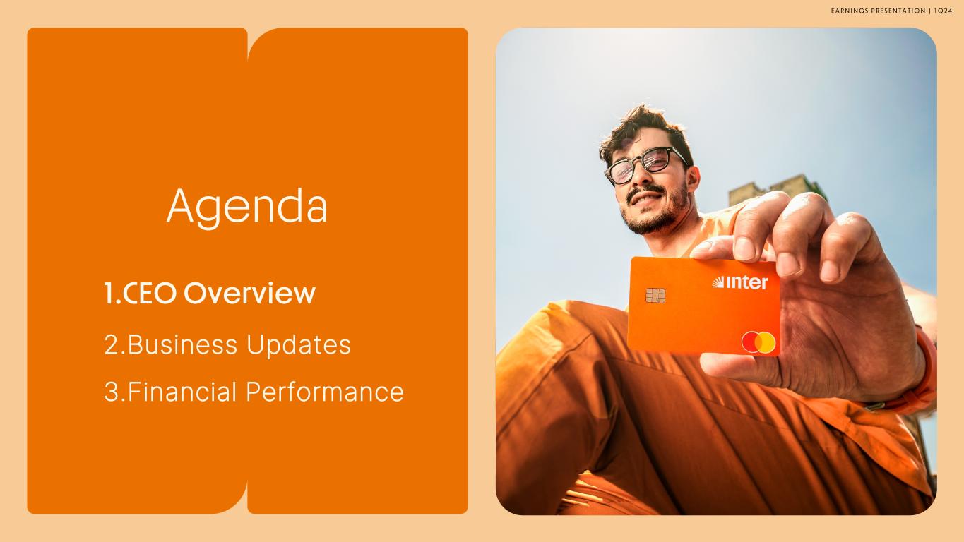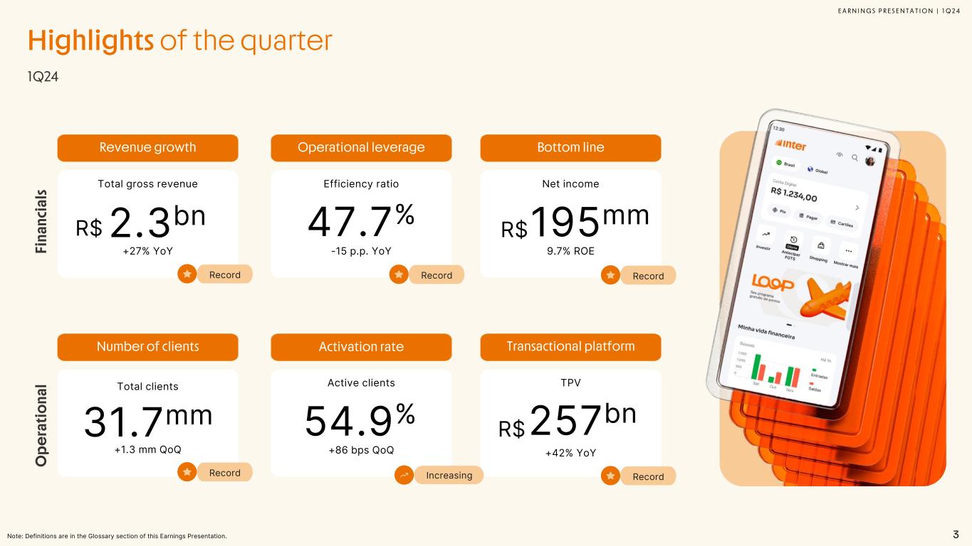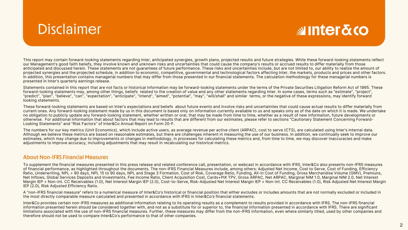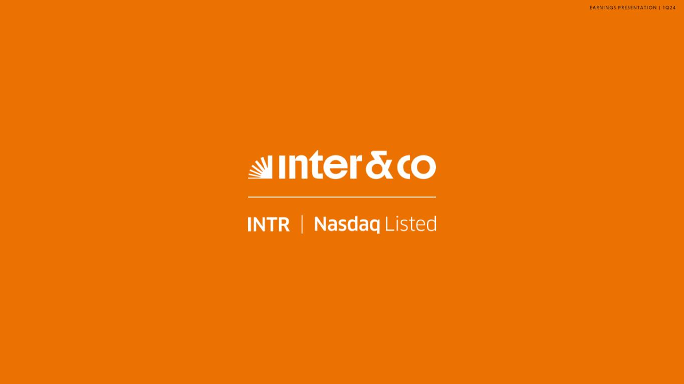 E A R N I N G S P R E S E N T A T I O N | 1 Q 2 4 Disclaimer This report may contain forward-looking statements regarding Inter, anticipated synergies, growth plans, projected results and future strategies. While these forward-looking statements reflect our Management’s good faith beliefs, they involve known and unknown risks and uncertainties that could cause the company’s results or accrued results to differ materially from those anticipated and discussed herein. These statements are not guarantees of future performance. These risks and uncertainties include, but are not limited to, our ability to realize the amount of projected synergies and the projected schedule, in addition to economic, competitive, governmental and technological factors affecting Inter, the markets, products and prices and other factors. In addition, this presentation contains managerial numbers that may differ from those presented in our financial statements. The calculation methodology for these managerial numbers is presented in Inter’s quarterly earnings release. Statements contained in this report that are not facts or historical information may be forward-looking statements under the terms of the Private Securities Litigation Reform Act of 1995. These forward-looking statements may, among other things, beliefs related to the creation of value and any other statements regarding Inter. In some cases, terms such as “estimate”, “project”, “predict”, “plan”, “believe”, “can”, “expectation”, “anticipate”, “intend”, “aimed”, “potential”, “may”, “will/shall” and similar terms, or the negative of these expressions, may identify forward looking statements. These forward-looking statements are based on Inter's expectations and beliefs about future events and involve risks and uncertainties that could cause actual results to differ materially from current ones. Any forward-looking statement made by us in this document is based only on information currently available to us and speaks only as of the date on which it is made. We undertake no obligation to publicly update any forward-looking statement, whether written or oral, that may be made from time to time, whether as a result of new information, future developments or otherwise. For additional information that about factors that may lead to results that are different from our estimates, please refer to sections “Cautionary Statement Concerning Forward- Looking Statements” and “Risk Factors” of Inter&Co Annual Report on Form 20-F. The numbers for our key metrics (Unit Economics), which include active users, as average revenue per active client (ARPAC), cost to serve (CTS), are calculated using Inter’s internal data. Although we believe these metrics are based on reasonable estimates, but there are challenges inherent in measuring the use of our business. In addition, we continually seek to improve our estimates, which may change due to improvements or changes in methodology, in processes for calculating these metrics and, from time to time, we may discover inaccuracies and make adjustments to improve accuracy, including adjustments that may result in recalculating our historical metrics. About Non-IFRS Financial Measures To supplement the financial measures presented in this press release and related conference call, presentation, or webcast in accordance with IFRS, Inter&Co also presents non-IFRS measures of financial performance, as highlighted throughout the documents. The non-IFRS Financial Measures include, among others: Adjusted Net Income, Cost to Serve, Cost of Funding, Efficiency Ratio, Underwriting, NPL > 90 days, NPL 15 to 90 days, NPL and Stage 3 Formation, Cost of Risk, Coverage Ratio, Funding, All-in Cost of Funding, Gross Merchandise Volume (GMV), Premiuns, Net Inflows, Global Services Deposits and Investments, Fee Income Ratio, Client Acquisition Cost, Cards+PIX TPV, Gross ARPAC, Net ARPAC, Marginal NIM 1.0, Marginal NIM 2.0, Net Interest Margin IEP + Non-int. CC Receivables (1.0), Net Interest Margin IEP (2.0), Cost-to-Serve, Risk-Adjusted Net Interest Margin IEP + Non-int. CC Receivables (1.0), Risk Adjusted Net Interest Margin IEP (2.0), Risk Adjusted Efficiency Ratio. A “non-IFRS financial measure” refers to a numerical measure of Inter&Co’s historical or financial position that either excludes or includes amounts that are not normally excluded or included in the most directly comparable measure calculated and presented in accordance with IFRS in Inter&Co’s financial statements. Inter&Co provides certain non-IFRS measures as additional information relating to its operating results as a complement to results provided in accordance with IFRS. The non-IFRS financial information presented herein should be considered together with, and not as a substitute for or superior to, the financial information presented in accordance with IFRS. There are significant limitations associated with the use of non-IFRS financial measures. Further, these measures may differ from the non-IFRS information, even where similarly titled, used by other companies and therefore should not be used to compare Inter&Co’s performance to that of other companies. 2