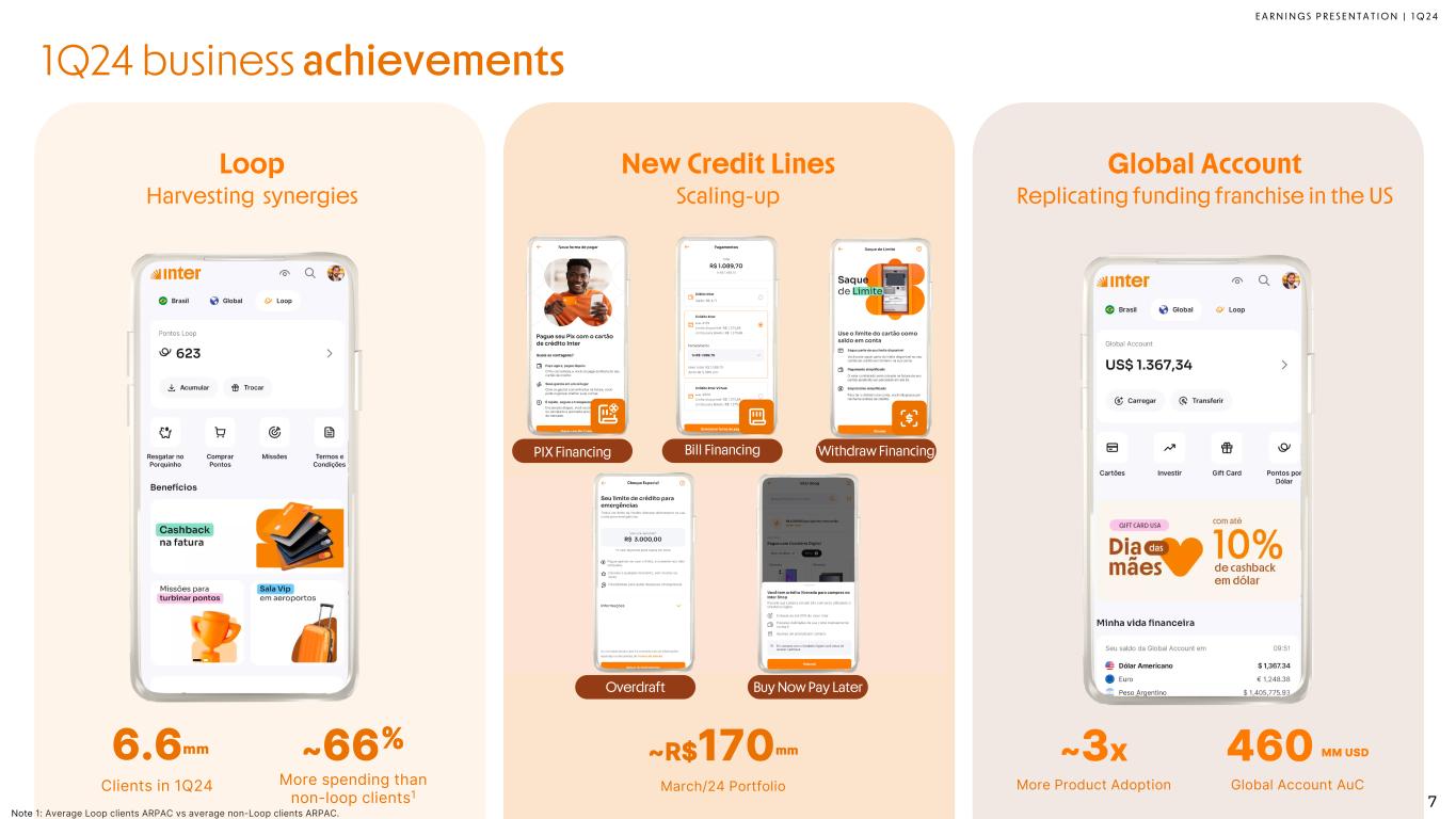 E A R N I N G S P R E S E N T A T I O N | 1 Q 2 4 Disrupting a gigantic market 6 Income Statement Growth Total Loans Index 100 = March 2021 Total Gross Revenue Index 100 = March 2021 Sources: Banco Central do Brasil and Inter. Note 1: Average of the 5 largest Brazilian commercial banks. Note 2: Data until January/2024. 2 8 0 1 30 1 80 2 3 0 2 8 0 3 3 0 1Q21 3Q21 1Q22 3Q22 1Q23 3Q23 1Q24 8 0 1 30 1 80 2 3 0 2 8 0 3 3 0 1Q21 3Q21 1Q22 3Q22 1Q23 3Q23 1Q24 8 0 1 30 1 80 2 3 0 2 8 0 3 3 0 1Q21 3Q21 1Q22 3Q22 1Q23 3Q23 1Q24 8 0 1 30 1 80 2 3 0 2 8 0 3 3 0 8 0 1 30 1 80 2 3 0 2 8 0 3 3 0 8 0 1 30 1 80 2 3 0 2 8 0 3 3 0 3 8 0 4 3 0 4 8 0 Top 5 Banks1 307 110 Top 5 Banks1 311 118 Top 5 Banks1 421 141 Balance Sheet Growth Client Growth Total Clients Index 100 = March 2021 2