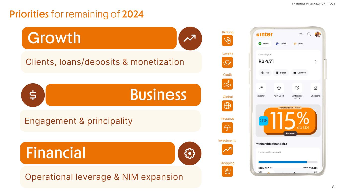 E A R N I N G S P R E S E N T A T I O N | 1 Q 2 4 Note 1: Average Loop clients ARPAC vs average non-Loop clients ARPAC. 1Q24 business achievements Loop Harvesting synergies New Credit Lines Scaling-up 6.6mm Global Account Replicating funding franchise in the US ~3x More Product AdoptionClients in 1Q24 ~66% More spending than non-loop clients1 460 MM USD Global Account AuC 7 Buy Now Pay LaterOverdraft PIX Financing Bill Financing Withdraw Financing ~R$170mm March/24 Portfolio