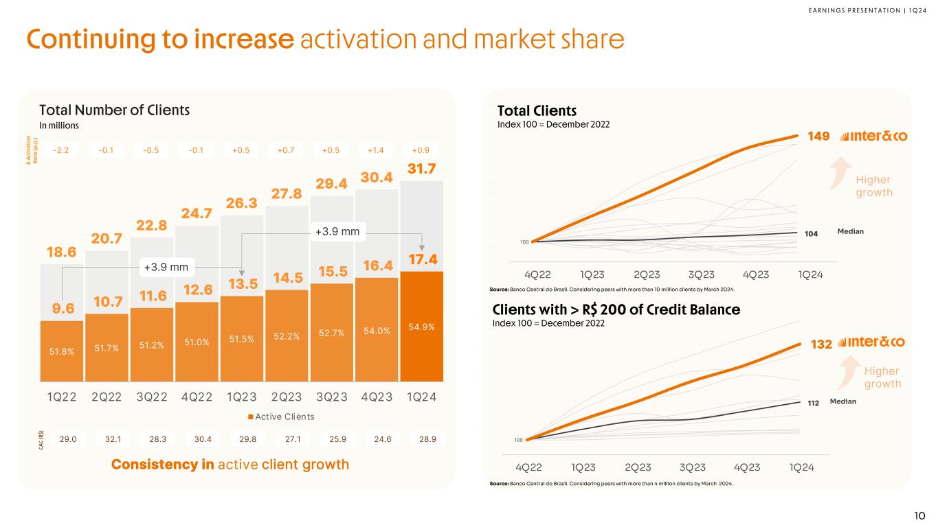 E A R N I N G S P R E S E N T A T I O N | 1 Q 2 4 Continuing to increase activation and market share Consistency in active client growth 51.8% 51.7% 51.2% 51.0% 51.5% 52.2% 52.7% 54.0% 54.9% 9.6 10.7 11.6 12.6 13.5 14.5 15.5 16.4 17.4 18.6 20.7 22.8 24.7 26.3 27.8 29.4 30.4 31.7 - 5 .0 1 0. 1 5.0 2 0. 2 5.0 3 0. 3 5.0 1Q22 2Q22 3Q22 4Q22 1Q23 2Q23 3Q23 4Q23 1Q24 Active Clients Total Number of Clients In millions +3.9 mm +3.9 mm Median Total Clients Index 100 = December 2022 Source: Banco Central do Brasil. Considering peers with more than 4 million clients by March 2024. Median 28.924.6 CA C (R $) 29.0 32.1 28.3 30.4 29.8 27.1 25.9 Source: Banco Central do Brasil. Considering peers with more than 10 million clients by March 2024. Clients with > R$ 200 of Credit Balance Index 100 = December 2022 Δ Ac tiv at io n Ra te (p .p .) +0.9+1.4-2.2 -0.1 -0.5 -0.1 +0.5 +0.7 +0.5 Higher growth Higher growth 90 100 110 120 130 140 150 4Q22 1Q23 2Q23 3Q23 4Q23 1Q24 100 104 149 90 100 110 120 130 140 150 160 90 100 110 120 130 140 150 4Q22 1Q23 2Q23 3Q23 4Q23 1Q24 100 112 132 5 100 105 10 115 120 125 130 135 140 145 10