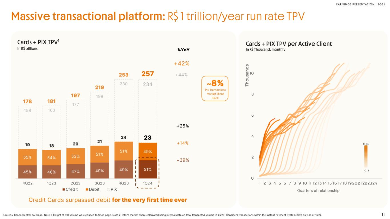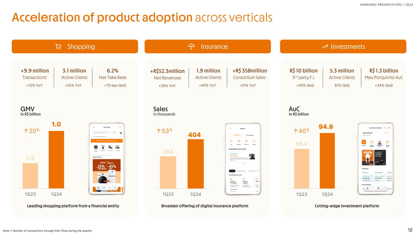 E A R N I N G S P R E S E N T A T I O N | 1 Q 2 4 45% 46% 47% 49% 49% 51% 55% 54% 53% 51% 51% 49% 19 18 20 21 24 23 158 163 177 198 230 234 178 181 197 219 253 257 0. 0 10. 0 20 .0 30 .0 40 .0 50 .0 60 .0 70 .0 4Q22 1Q23 2Q23 3Q23 4Q23 1Q24 Credit Debit PIX +25% +39% +44% +42% %YoY +14% Quarters of relationship Cards + PIX TPV per Active Client In R$ Thousand, monthly 11 ~8% Pix Transactions Market Share 1Q242 Cards + PIX TPV1 In R$ billions Credit Cards surpassed debit for the very first time ever Massive transactional platform: R$ 1 trillion/year run rate TPV Sources: Banco Central do Brasil. Note 1: Height of PIX volume was reduced to fit on page. Note 2: Inter’s market share calculated using internal data on total transacted volume in 4Q23; Considers transactions within the Instant Payment System (SPI) only as of 1Q24. 0 2 4 6 8 10 1 2 3 4 5 6 7 8 9 10 11 12 13 14 15 16 17 18 19 20 21 222324 Th ou sa nd s 1T24 1Q18