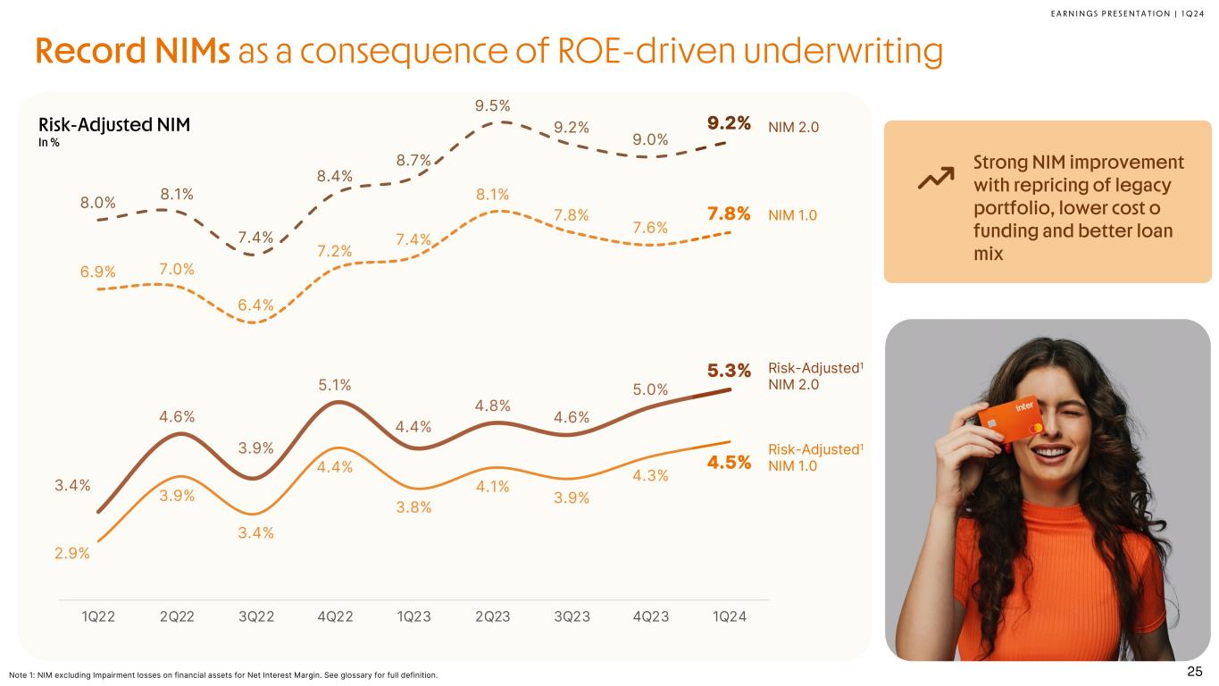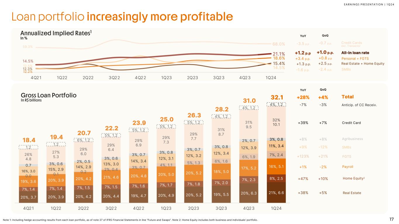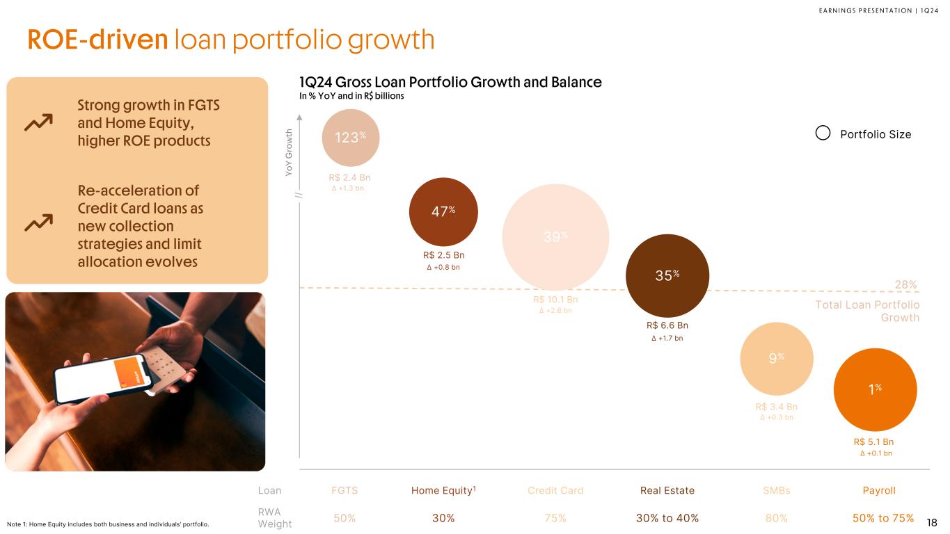 E A R N I N G S P R E S E N T A T I O N | 1 Q 2 4 Loan portfolio increasingly more profitable 12.3% 15.4% 12.2% 18.6% 12.5% 14.5% 14.5% 21.1% 59.3% 68.0% 0 .0 % 10 .0 % 2 0. 0% 3 0. 0% 4 0. 0% 5 0. 0% 6 0. 0% 7 0. 0% 8 0. 0% 4Q21 1Q22 2Q22 3Q22 4Q22 1Q23 2Q23 3Q23 4Q23 1Q24 17Note 1: Including hedge accounting results from each loan portfolio, as of note 27 of IFRS Financial Statements in line “Future and Swaps”. Note 2: Home Equity includes both business and individuals’ portfolio. Annualized Implied Rates1 In % +0.8 p.p Real Estate + Home Equity Personal + FGTS All-in loan rate Credit Cards exc. Transactor SMBs -0.7 p.p.-3.5 p.p +1.0 p.p.+1.2 p.p +3.4 p.p. +2.5 p.p.+1.3 p.p. YoY QoQ -2.4 p.p.-1.6 p.p. YoY FGTS Payroll Home Equity2 Real Estate SMBs Agribusiness Credit Card Anticip. of CC Receiv. Total +8% +9% +1% +38% +39% +28% +123% -7% +8% -12% -2% +5% +7% +4% +21% -3% +47% +10% QoQ 20%, 3.7 20%, 3.9 20%, 4.2 20%, 4.4 19%, 4.7 20%, 4.9 20%, 5.2 19%, 5.5 20%, 6.3 21%, 6.6 7%, 1.4 7%, 1.4 7%, 1.5 7%, 1.5 7%, 1.6 7%, 1.7 7%, 1.8 7%, 2.0 7%, 2.3 8%, 2.5 19%, 3.6 20%, 3.9 20%, 4.2 21%, 4.6 20%, 4.8 20%, 5.0 20%, 5.2 18%, 5.0 17%, 5.2 16%, 5.1 0.0 0.1 0.2 2%, 0.4 3%, 0.7 4%, 1.1 5%, 1.3 6%, 1.6 6%, 1.9 7%, 2.4 16%, 3.0 15%, 2.9 14%, 2.9 13%, 3.0 14%, 3.4 12%, 3.1 12%, 3.2 12%, 3.4 12%, 3.9 11%, 3.4 0.7 3%, 0.6 2%, 0.5 3%, 0.6 3%, 0.7 3%, 0.8 3%, 0.7 3%, 0.8 2%, 0.7 3%, 0.8 26% 4.8 27% 5.3 29% 6.0 29% 6.4 29% 6.9 29% 7.3 29% 7.7 31% 8.7 31% 9.5 32% 10.1 1.2 1.2 6%, 1.2 5%, 1.2 5%, 1.2 5%, 1.2 5%, 1.2 4%, 1.2 4%, 1.2 4%, 1.2 18.4 19.4 20.7 22.2 23.9 25.0 26.3 28.2 31.0 32.1 0 .0 5 .0 10 .0 15 .0 2 0. 0 2 5. 0 3 0. 0 3 5. 0 4Q21 1Q22 2Q22 3Q22 4Q22 1Q23 2Q23 3Q23 4Q23 1Q24 Gross Loan Portfolio In R$ billions