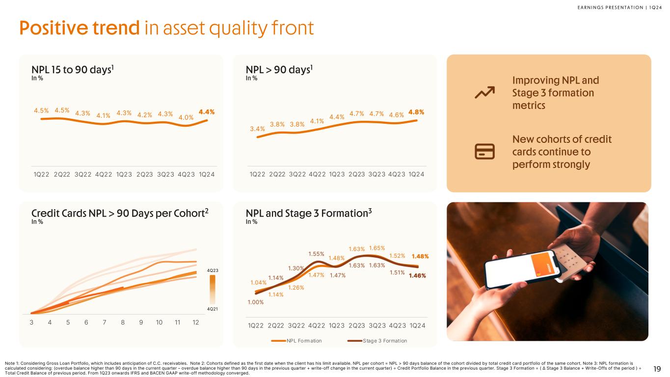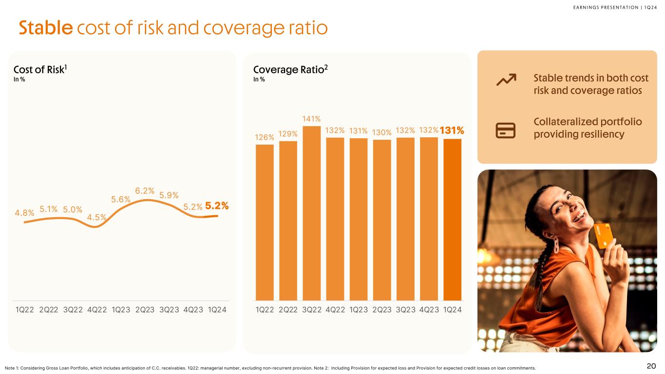 E A R N I N G S P R E S E N T A T I O N | 1 Q 2 4 Positive trend in asset quality front Improving NPL and Stage 3 formation metrics New cohorts of credit cards continue to perform strongly 3 4 5 6 7 8 9 10 11 12 3.4% 3.8% 3.8% 4.1% 4.4% 4.7% 4.7% 4.6% 4.8% 1.0% 2.0% 3.0% 4.0% 5.0% 6.0% 7.0% 8.0% 1Q22 2Q22 3Q22 4Q22 1Q23 2Q23 3Q23 4Q23 1Q24 4.5% 4.5% 4.3% 4.1% 4.3% 4.2% 4.3% 4.0% 4.4% 1.0% 2.0% 3.0% 4.0% 5.0% 6.0% 7.0% 8.0% 1Q22 2Q22 3Q22 4Q22 1Q23 2Q23 3Q23 4Q23 1Q24 1.04% 1.14% 1.26% 1.47% 1.48% 1.63% 1.65% 1.52% 1.48% 1.00% 1.14% 1.30% 1.55% 1.47% 1.63% 1.63% 1.51% 1.46% 0 .6 % 0 .8 % 1. 0% 1. 2% 1. 4% 1. 6% 1. 8% 2 .0 % 2 .2 % 1Q22 2Q22 3Q22 4Q22 1Q23 2Q23 3Q23 4Q23 1Q24 NPL Formation Stage 3 Formation 19 NPL > 90 days1 In % Credit Cards NPL > 90 Days per Cohort2 In % NPL 15 to 90 days1 In % NPL and Stage 3 Formation3 In % Note 1: Considering Gross Loan Portfolio, which includes anticipation of C.C. receivables. Note 2: Cohorts defined as the first date when the client has his limit available. NPL per cohort = NPL > 90 days balance of the cohort divided by total credit card portfolio of the same cohort. Note 3: NPL formation is calculated considering: (overdue balance higher than 90 days in the current quarter – overdue balance higher than 90 days in the previous quarter + write-off change in the current quarter) ÷ Credit Portfolio Balance in the previous quarter. Stage 3 Formation = ( Δ Stage 3 Balance + Write-Offs of the period ) ÷ Total Credit Balance of previous period. From 1Q23 onwards IFRS and BACEN GAAP write-off methodology converged. 4Q23 4Q21