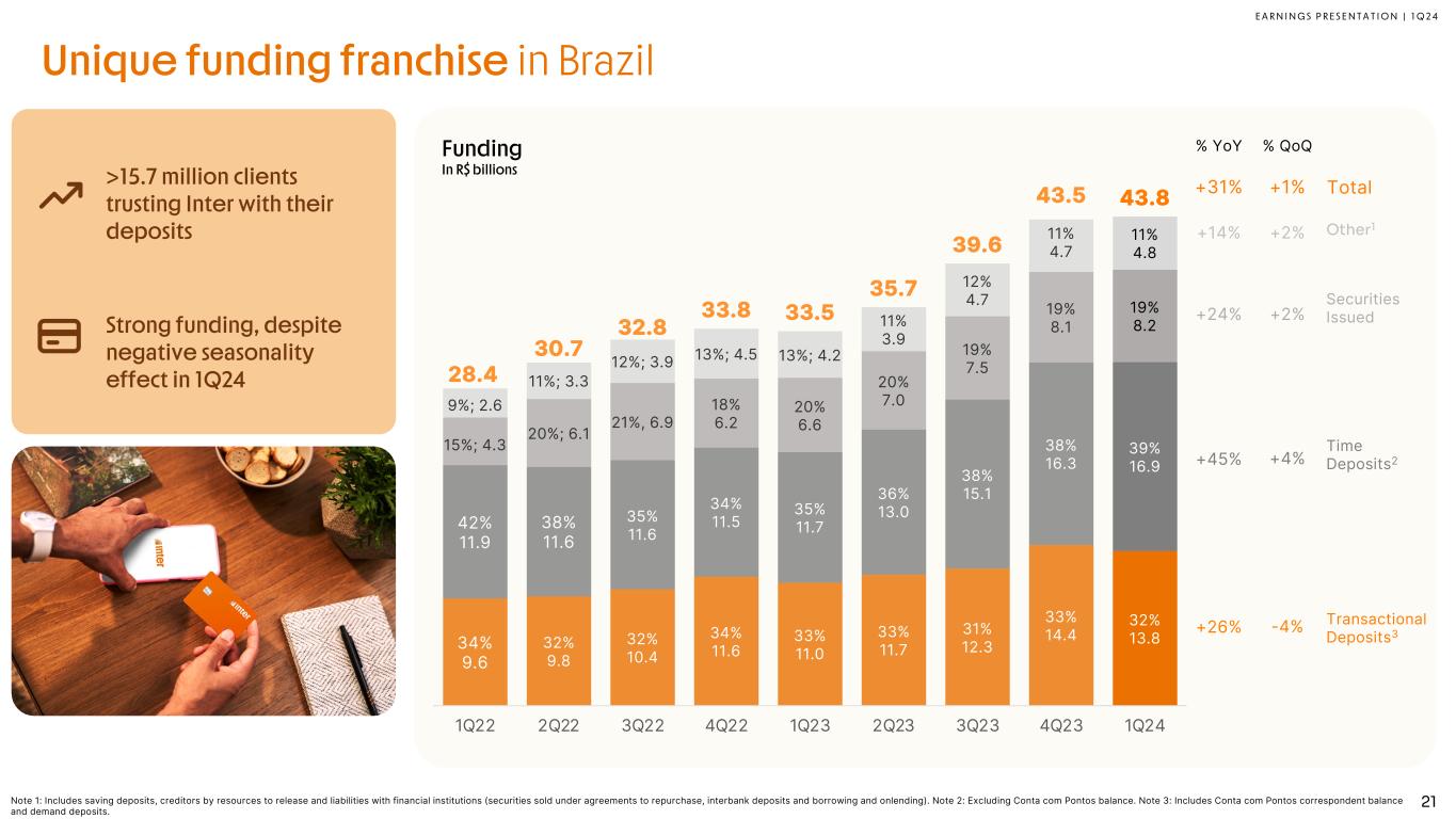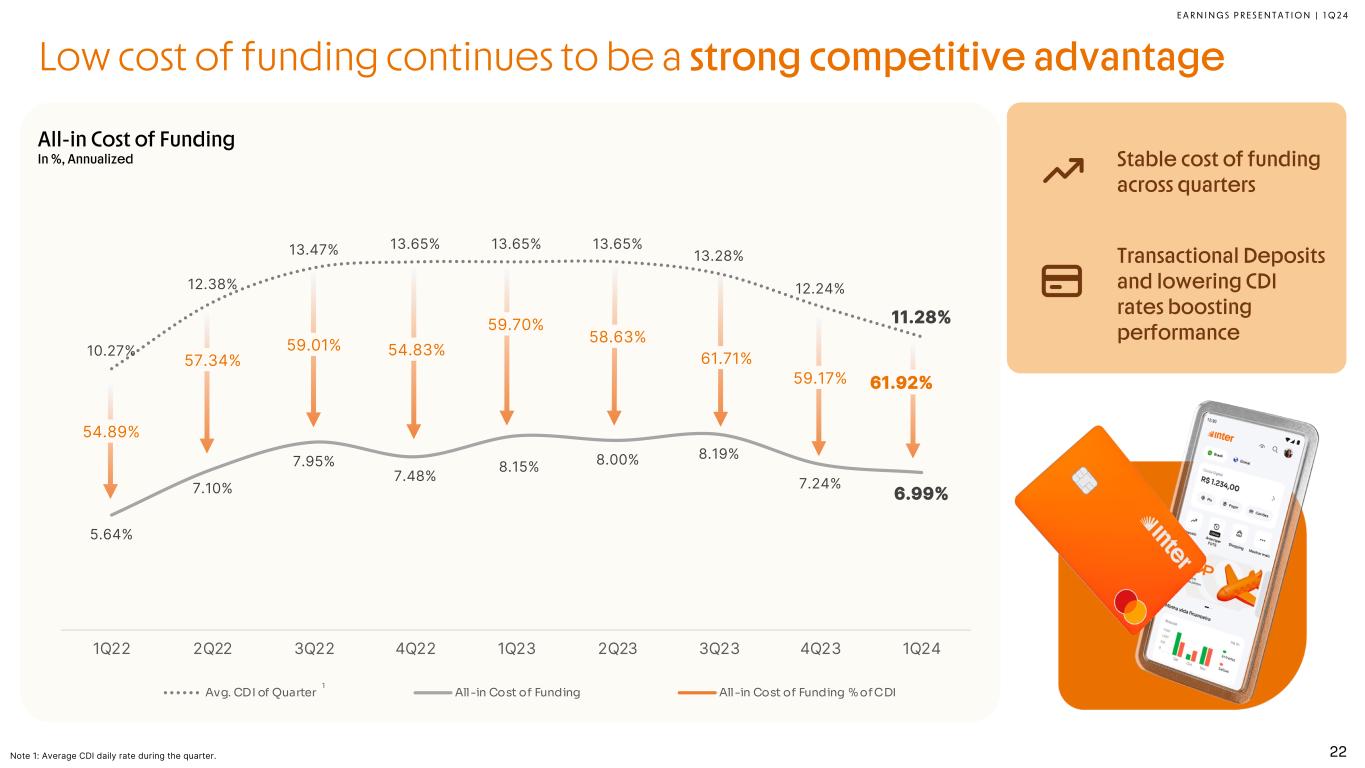E A R N I N G S P R E S E N T A T I O N | 1 Q 2 4 34% 9.6 32% 9.8 32% 10.4 34% 11.6 33% 11.0 33% 11.7 31% 12.3 33% 14.4 32% 13.8 42% 11.9 38% 11.6 35% 11.6 34% 11.5 35% 11.7 36% 13.0 38% 15.1 38% 16.3 39% 16.9 15%; 4.3 20%; 6.1 21%, 6.9 18% 6.2 20% 6.6 20% 7.0 19% 7.5 19% 8.1 19% 8.2 9%; 2.6 11%; 3.3 12%; 3.9 13%; 4.5 13%; 4.2 11% 3.9 12% 4.7 11% 4.7 11% 4.8 28.4 30.7 32.8 33.8 33.5 35.7 39.6 43.5 43.8 1Q22 2Q22 3Q22 4Q22 1Q23 2Q23 3Q23 4Q23 1Q24 Time Deposits2 Securities Issued Other1 Transactional Deposits3 Total +14% % YoY % QoQ +2% +24% +2% +45% +4% +26% -4% +31% +1% 21 >15.7 million clients trusting Inter with their deposits Strong funding, despite negative seasonality effect in 1Q24 Unique funding franchise in Brazil Funding In R$ billions Note 1: Includes saving deposits, creditors by resources to release and liabilities with financial institutions (securities sold under agreements to repurchase, interbank deposits and borrowing and onlending). Note 2: Excluding Conta com Pontos balance. Note 3: Includes Conta com Pontos correspondent balance and demand deposits.