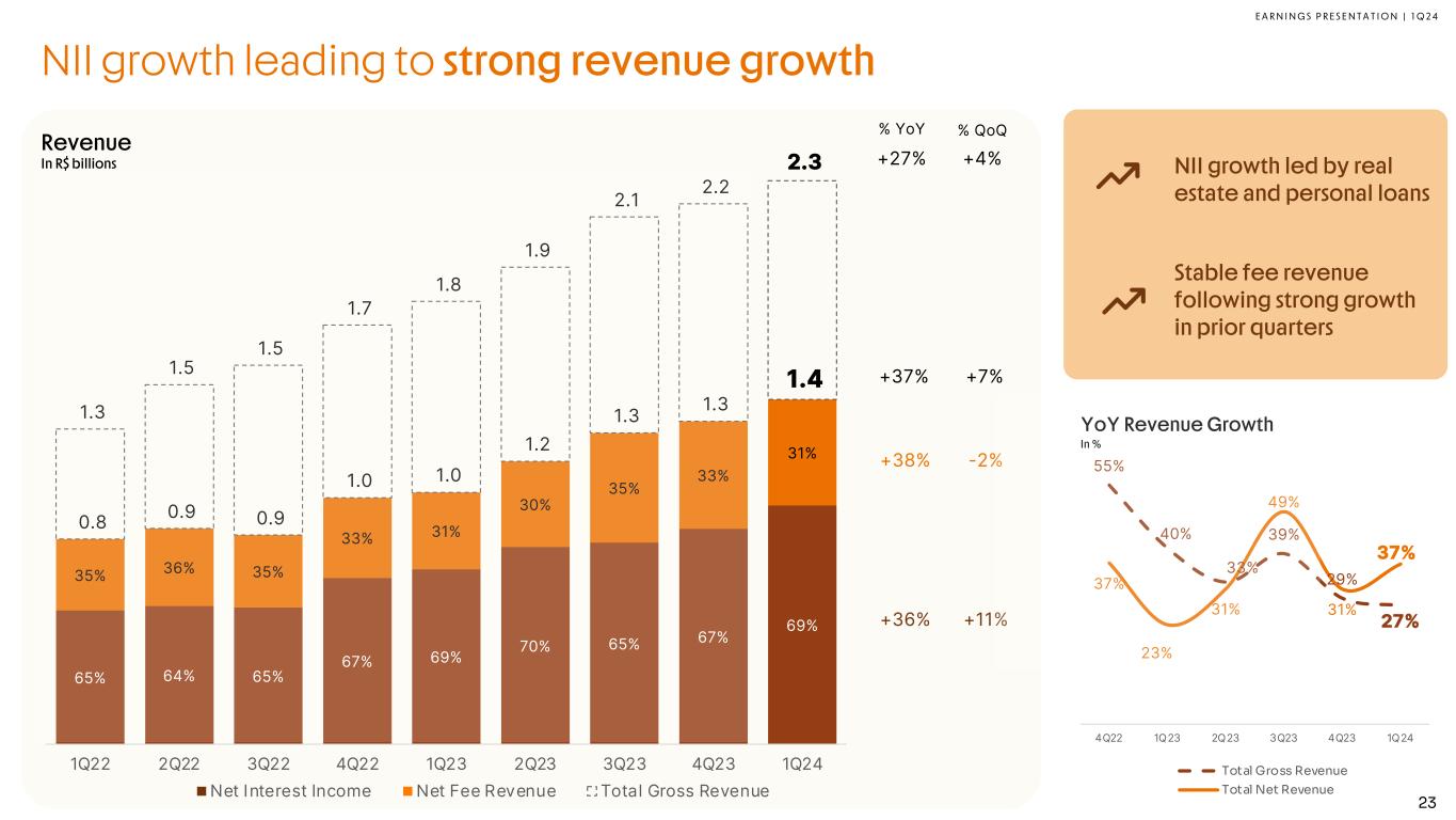 E A R N I N G S P R E S E N T A T I O N | 1 Q 2 4 1.0 1.2 1.3 1.3 1.4 1.8 1.9 2.1 2.2 2.3 - 0 .5 1 .0 1 .5 2 .0 2 .5 1Q23 2Q23 3Q234Q23 1Q24 Net Interest Income Net Fee Revenue Total Gross Revenue 65% 64% 65% 67% 69% 70% 65% 67% 69% 35% 36% 35% 33% 31% 30% 35% 33% 31% 0.8 0.9 0.9 1.0 1.0 1.2 1.3 1.3 1.4 1.3 1.5 1.5 1.7 1.8 1.9 2.1 2.2 2.3 - 0 .5 1 .0 1 .5 2 .0 2 .5 1Q22 2Q22 3Q22 4Q22 1Q23 2Q23 3Q23 4Q23 1Q24 % YoY +27% +36% +37% +38% % QoQ +4% +11% +7% -2% NII growth led by real estate and personal loans Stable fee revenue following strong growth in prior quarters Revenue In R$ billions NII growth leading to strong revenue growth YoY Revenue Growth In % 55% 40% 33% 39% 29% 27% 37% 23% 31% 49% 31% 37% 0 .0 % 10 .0 % 2 0. 0% 3 0. 0% 4 0. 0% 5 0. 0% 6 0. 0% 4Q22 1Q23 2Q23 3Q23 4Q23 1Q24 Total Gross Revenue Total Net Revenue 23