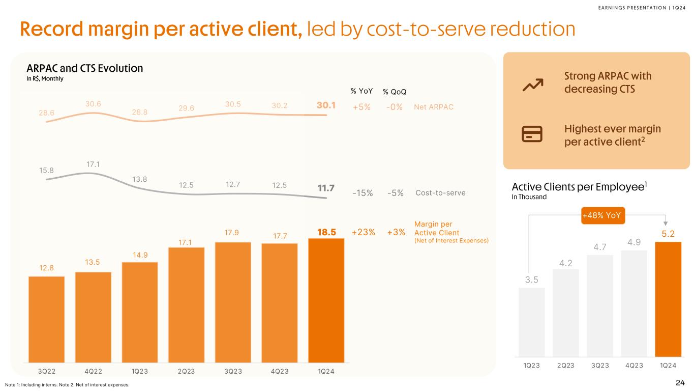 E A R N I N G S P R E S E N T A T I O N | 1 Q 2 4 ARPAC and CTS Evolution In R$, Monthly 12.8 13.5 14.9 17.1 17.9 17.7 18.5 28.6 30.6 28.8 29.6 30.5 30.2 30.1 15.8 17.1 13.8 12.5 12.7 12.5 11.7 3Q22 4Q22 1Q23 2Q23 3Q23 4Q23 1Q24 Cost-to-serve Margin per Active Client (Net of Interest Expenses) Net ARPAC 3.5 4.2 4.7 4.9 5.2 1.0 1.5 2.0 2.5 3.0 3.5 4.0 4.5 5.0 5.5 1Q23 2Q23 3Q23 4Q23 1Q24 Active Clients per Employee1 In Thousand Strong ARPAC with decreasing CTS Highest ever margin per active client2 Record margin per active client, led by cost-to-serve reduction Note 1: Including interns. Note 2: Net of interest expenses. +48% YoY % YoY +5% -15% +23% % QoQ -0% -5% +3% 24
