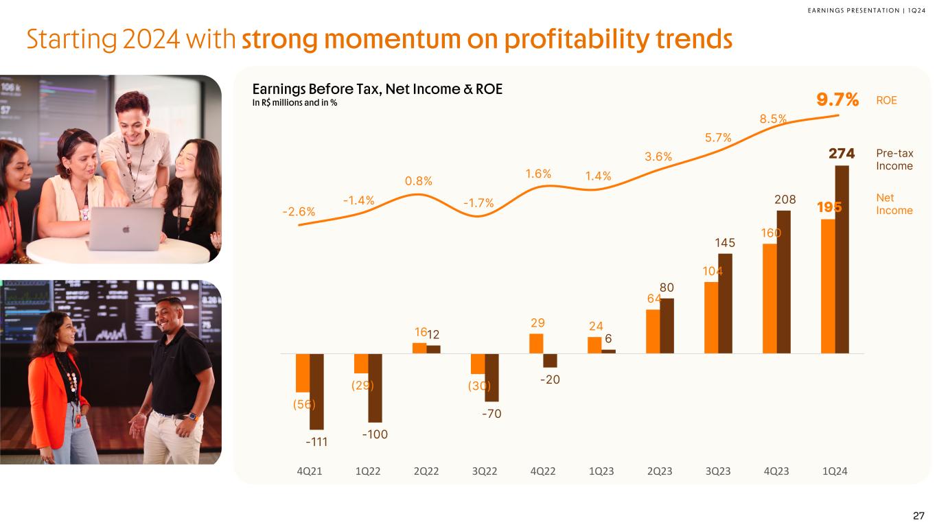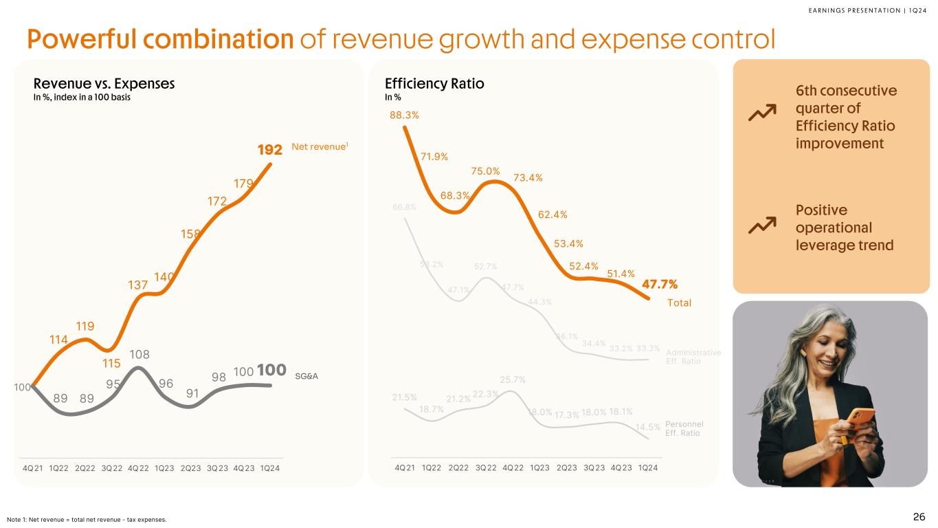 E A R N I N G S P R E S E N T A T I O N | 1 Q 2 4 114 119 115 137 140 158 172 179 192 100 89 89 95 108 96 91 98 100 100 7 0 10 0 13 0 16 0 19 0 2 20 4Q21 1Q22 2Q22 3Q22 4Q22 1Q23 2Q23 3Q23 4Q23 1Q24 88.3% 71.9% 68.3% 75.0% 73.4% 62.4% 53.4% 52.4% 51.4% 47.7% 21.5% 18.7% 21.2% 22.3% 25.7% 18.0% 17.3% 18.0% 18.1% 14.5% 66.8% 53.2% 47.1% 52.7% 47.7% 44.3% 36.1% 34.4% 33.2% 33.3% 10 % 2 0% 3 0% 4 0% 5 0% 6 0% 7 0% 8 0% 9 0% 4Q21 1Q22 2Q22 3Q22 4Q22 1Q23 2Q23 3Q23 4Q23 1Q24 SG&A Total Administrative Eff. Ratio Personnel Eff. Ratio 6th consecutive quarter of Efficiency Ratio improvement Positive operational leverage trend Powerful combination of revenue growth and expense control Note 1: Net revenue = total net revenue - tax expenses. Revenue vs. Expenses In %, index in a 100 basis Efficiency Ratio In % Net revenue1 26
