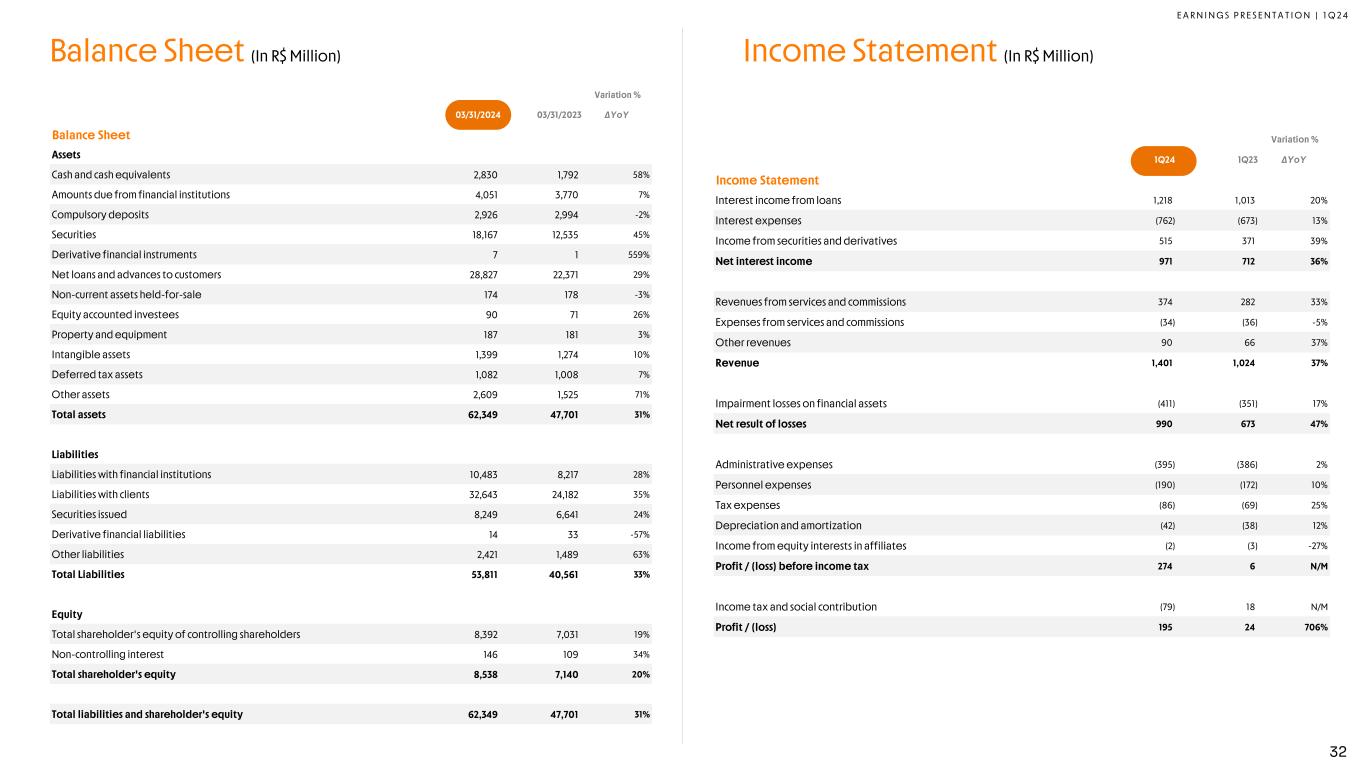 E A R N I N G S P R E S E N T A T I O N | 1 Q 2 4 Balance Sheet (In R$ Million) Income Statement (In R$ Million) 32 1Q24 1Q23 Variation % 03/31/2024 03/31/2023 ∆YoY Balance Sheet Assets Cash and cash equivalents 2,830 1,792 58% Amounts due from financial institutions 4,051 3,770 7% Compulsory deposits 2,926 2,994 -2% Securities 18,167 12,535 45% Derivative financial instruments 7 1 559% Net loans and advances to customers 28,827 22,371 29% Non-current assets held-for-sale 174 178 -3% Equity accounted investees 90 71 26% Property and equipment 187 181 3% Intangible assets 1,399 1,274 10% Deferred tax assets 1,082 1,008 7% Other assets 2,609 1,525 71% Total assets 62,349 47,701 31% Liabilities Liabilities with financial institutions 10,483 8,217 28% Liabilities with clients 32,643 24,182 35% Securities issued 8,249 6,641 24% Derivative financial liabilities 14 33 -57% Other liabilities 2,421 1,489 63% Total Liabilities 53,811 40,561 33% Equity Total shareholder's equity of controlling shareholders 8,392 7,031 19% Non-controlling interest 146 109 34% Total shareholder's equity 8,538 7,140 20% Total liabilities and shareholder's equity 62,349 47,701 31% Variation % 1Q24 1Q23 ∆YoY Income Statement Interest income from loans 1,218 1,013 20% Interest expenses (762) (673) 13% Income from securities and derivatives 515 371 39% Net interest income 971 712 36% Revenues from services and commissions 374 282 33% Expenses from services and commissions (34) (36) -5% Other revenues 90 66 37% Revenue 1,401 1,024 37% Impairment losses on financial assets (411) (351) 17% Net result of losses 990 673 47% Administrative expenses (395) (386) 2% Personnel expenses (190) (172) 10% Tax expenses (86) (69) 25% Depreciation and amortization (42) (38) 12% Income from equity interests in affiliates (2) (3) -27% Profit / (loss) before income tax 274 6 N/M Income tax and social contribution (79) 18 N/M Profit / (loss) 195 24 706%
