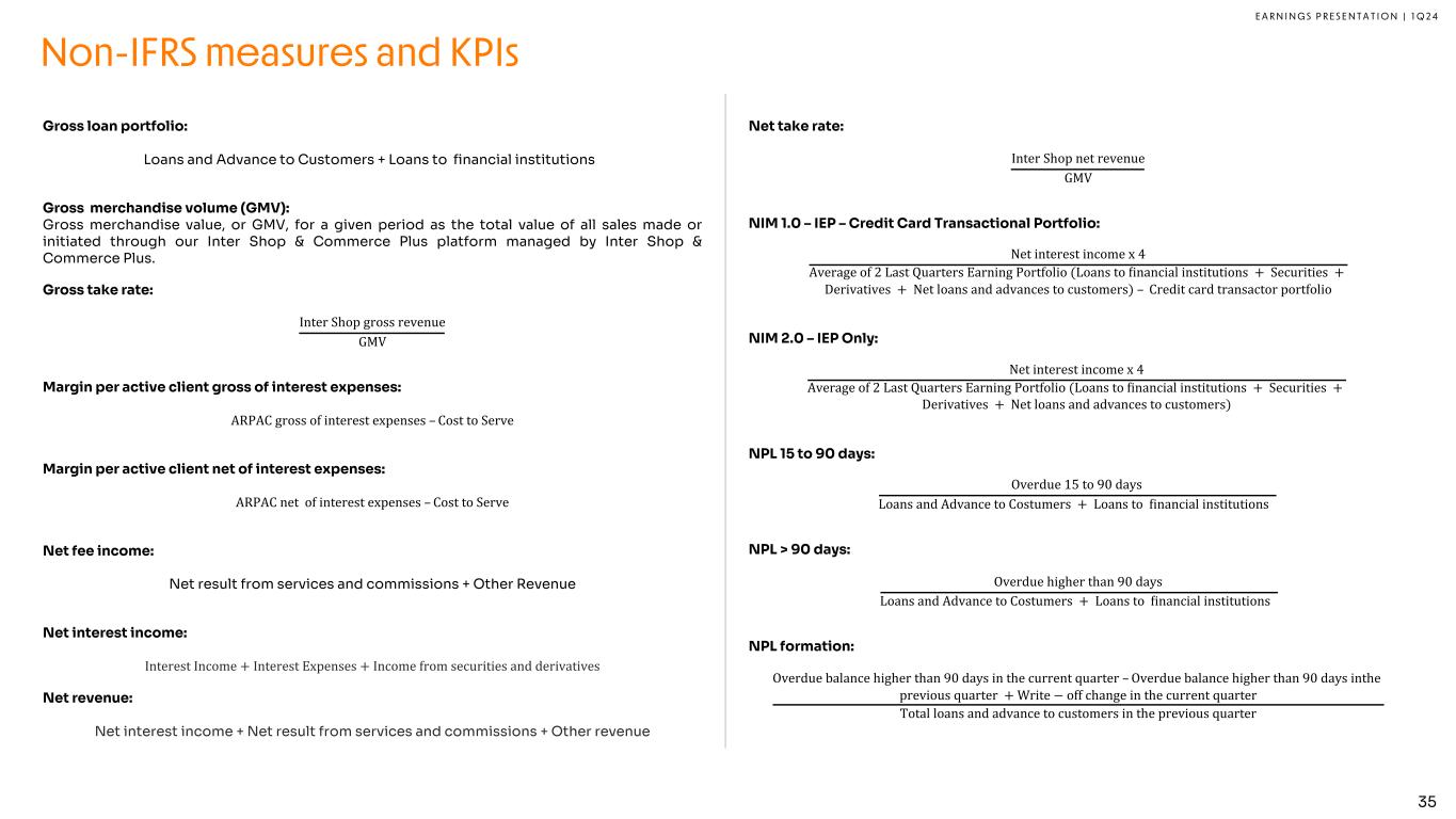 E A R N I N G S P R E S E N T A T I O N | 1 Q 2 4 34 Card+PIX TPV: PIX, debit and credit cards and withdrawal transacted volumes of a given period. PIX is a Central Bank of Brazil solution to bring instant payments among banks and financial institutions in Brazil. Card+PIX TPV per active client: Card+PIX TPV for a given period divided by the number of active clients as of the last day of the period. Cost of funding: Interest expenses × 4 Average of last 2 quarters Interest bearing liabilities (demand deposits, time deposits, savings deposits, creditors by resources to release, securities issued, securities sold under agreements to repurchase, interbank deposits and others) Cost of risk: Impairment losses on Minancial assets × 4 Average of last 2 quarters of Loans and advances to customers Cost of risk excluding anticipation of credit card receivables: Impairment losses on Minancial assets × 4 Average of last 2 quarters of Loans and advances to customers excluding anticipation of credit card receivables Cost of risk excluding credit card: Impairment losses on Minancial assets × 4 Average of last 2 quarters of Loans and advances to customers excluding credit card Cost-to-serve (CTS): Personnel Expense + Administrative Expenses − Total CAC ÷ 3 Average of the last 2 quarters Active Clients Coverage ratio: Provision for expected credit loss Overdue higher than 90 days Earning portfolio (IEP): Earnings Portfolio includes “Amounts due from financial institutions” + “Loans and advances to customers” + “Securities” + “Derivatives” from the IFRS Balance Sheet Efficiency ratio: Personnel expense + Administrative expenses + Depreciation and amortization Net Interest Income + Net result from services and comissions + Other revenue − Tax expense Fee revenue ratio: Net result from services and commissions + Other revenue Net Interest Income + Net result from services and comissions + Other revenue − Tax expense Funding: Demand Deposits + Time Deposits + Securities Issued + Savings Deposits + Creditors by Resources to Release + Securities sold under agreements to repurchase + Interbank deposits + Borrowing and onlending Global Services Clients: Includes Brazilian Global Account clients, US clients and international investors. Non-IFRS measures and KPIs
