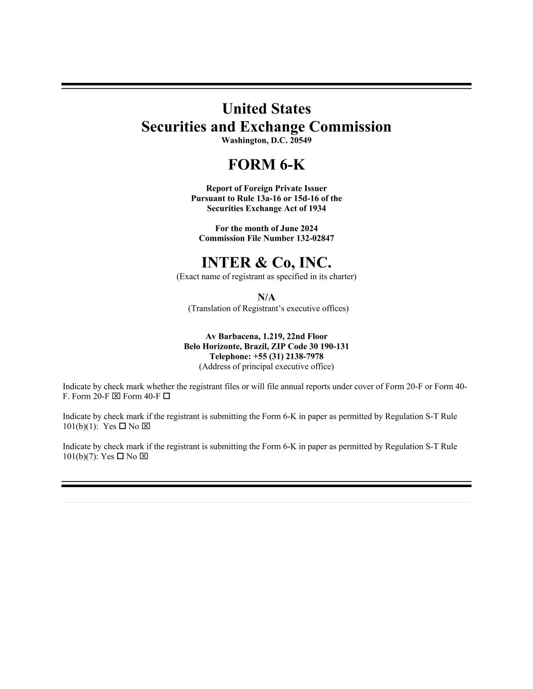 United States Securities and Exchange Commission Washington, D.C. 20549 FORM 6-K Report of Foreign Private Issuer Pursuant to Rule 13a-16 or 15d-16 of the Securities Exchange Act of 1934 For the month of June 2024 Commission File Number 132-02847 INTER & Co, INC. (Exact name of registrant as specified in its charter) N/A (Translation of Registrant’s executive offices) Av Barbacena, 1.219, 22nd Floor Belo Horizonte, Brazil, ZIP Code 30 190-131 Telephone: +55 (31) 2138-7978 (Address of principal executive office) Indicate by check mark whether the registrant files or will file annual reports under cover of Form 20-F or Form 40- F. Form 20-F x Form 40-F o Indicate by check mark if the registrant is submitting the Form 6-K in paper as permitted by Regulation S-T Rule 101(b)(1): Yes o No x Indicate by check mark if the registrant is submitting the Form 6-K in paper as permitted by Regulation S-T Rule 101(b)(7): Yes o No x
