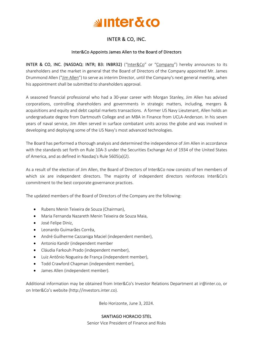 INTER & CO, INC. Inter&Co Appoints James Allen to the Board of Directors INTER & CO, INC. (NASDAQ: INTR; B3: INBR32) (“Inter&Co” or “Company”) hereby announces to its shareholders and the market in general that the Board of Directors of the Company appointed Mr. James Drummond Allen ("Jim Allen”) to serve as interim Director, until the Company's next general meeting, when his appointment shall be submitted to shareholders approval. A seasoned financial professional who had a 30-year career with Morgan Stanley, Jim Allen has advised corporations, controlling shareholders and governments in strategic matters, including, mergers & acquisitions and equity and debt capital markets transactions. A former US Navy Lieutenant, Allen holds an undergraduate degree from Dartmouth College and an MBA in Finance from UCLA-Anderson. In his seven years of naval service, Jim Allen served in surface combatant units across the globe and was involved in developing and deploying some of the US Navy’s most advanced technologies. The Board has performed a thorough analysis and determined the independence of Jim Allen in accordance with the standards set forth on Rule 10A-3 under the Securities Exchange Act of 1934 of the United States of America, and as defined in Nasdaq’s Rule 5605(a)(2). As a result of the election of Jim Allen, the Board of Directors of Inter&Co now consists of ten members of which six are independent directors. The majority of independent directors reinforces Inter&Co's commitment to the best corporate governance practices. The updated members of the Board of Directors of the Company are the following: • Rubens Menin Teixeira de Souza (Chairman), • Maria Fernanda Nazareth Menin Teixeira de Souza Maia, • José Felipe Diniz, • Leonardo Guimarães Corrêa, • André Guilherme Cazzaniga Maciel (independent member), • Antonio Kandir (independent member • Cláudia Farkouh Prado (independent member), • Luiz Antônio Nogueira de França (independent member), • Todd Crawford Chapman (independent member), • James Allen (independent member). Additional information may be obtained from Inter&Co's Investor Relations Department at ir@inter.co, or on Inter&Co’s website (http://investors.inter.co). Belo Horizonte, June 3, 2024. SANTIAGO HORACIO STEL Senior Vice President of Finance and Risks