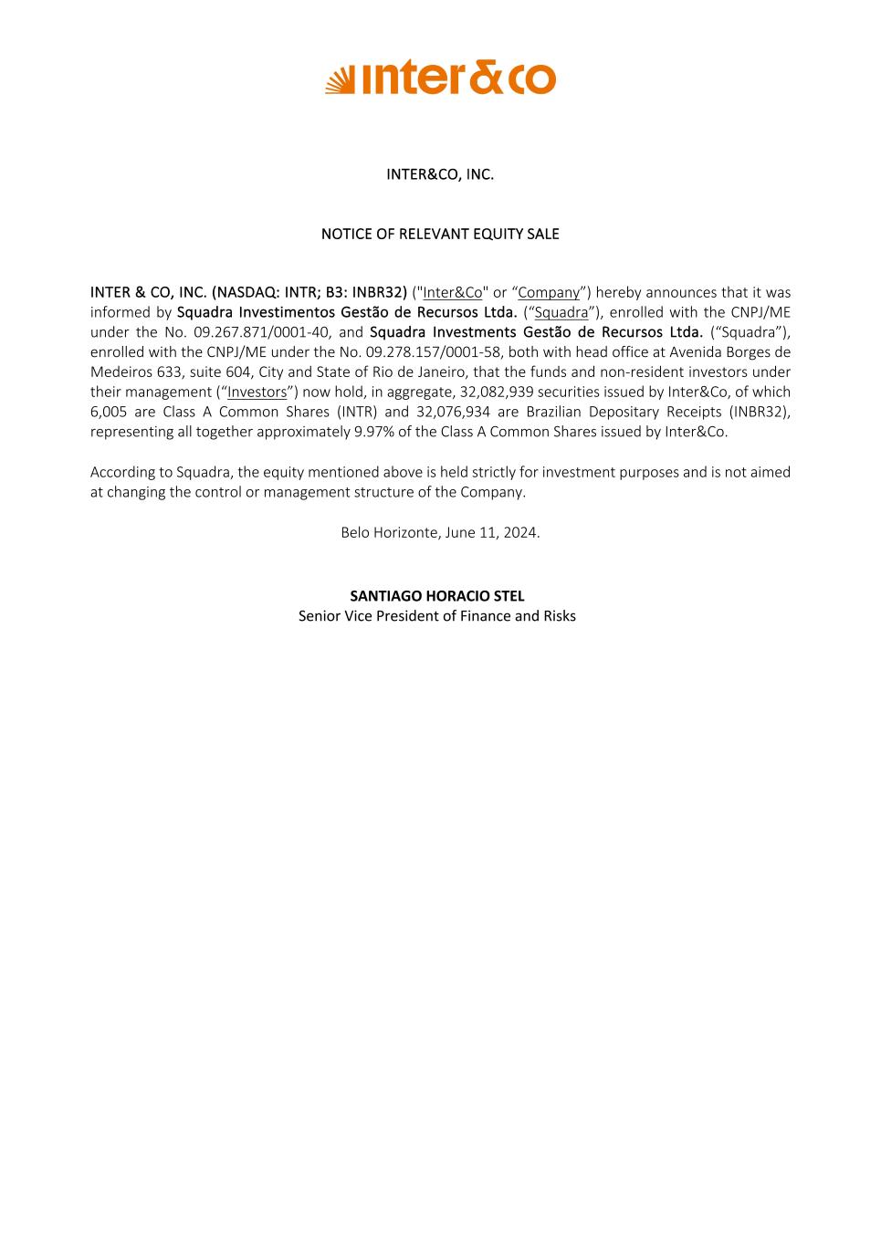 INTER&CO, INC. NOTICE OF RELEVANT EQUITY SALE INTER & CO, INC. (NASDAQ: INTR; B3: INBR32) ("Inter&Co" or “Company”) hereby announces that it was informed by Squadra Investimentos Gestão de Recursos Ltda. (“Squadra”), enrolled with the CNPJ/ME under the No. 09.267.871/0001-40, and Squadra Investments Gestão de Recursos Ltda. (“Squadra”), enrolled with the CNPJ/ME under the No. 09.278.157/0001-58, both with head office at Avenida Borges de Medeiros 633, suite 604, City and State of Rio de Janeiro, that the funds and non-resident investors under their management (“Investors”) now hold, in aggregate, 32,082,939 securities issued by Inter&Co, of which 6,005 are Class A Common Shares (INTR) and 32,076,934 are Brazilian Depositary Receipts (INBR32), representing all together approximately 9.97% of the Class A Common Shares issued by Inter&Co. According to Squadra, the equity mentioned above is held strictly for investment purposes and is not aimed at changing the control or management structure of the Company. Belo Horizonte, June 11, 2024. SANTIAGO HORACIO STEL Senior Vice President of Finance and Risks