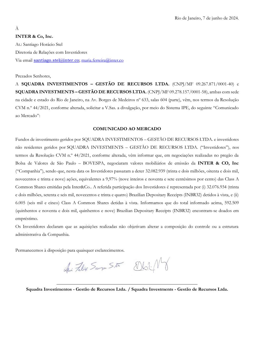 Rio de Janeiro, 7 de junho de 2024. À INTER & Co, Inc. At.: Santiago Horácio Stel Diretoria de Relações com Investidores Via email santiago.stel@inter.co; maria.ferreira@inter.co Prezados Senhores, A SQUADRA INVESTIMENTOS – GESTÃO DE RECURSOS LTDA. (CNPJ/MF 09.267.871/0001-40) e SQUADRA INVESTMENTS – GESTÃO DE RECURSOS LTDA. (CNPJ/MF 09.278.157/0001-58), ambas com sede na cidade e estado do Rio de Janeiro, na Av. Borges de Medeiros nº 633, salas 604 (parte), vêm, nos termos da Resolução CVM n.º 44/2021, conforme alterada, solicitar a V.Sas. a divulgação, por meio do Sistema IPE, do seguinte “Comunicado ao Mercado”: COMUNICADO AO MERCADO Fundos de investimento geridos por SQUADRA INVESTIMENTOS – GESTÃO DE RECURSOS LTDA. e investidores não residentes geridos por SQUADRA INVESTMENTS – GESTÃO DE RECURSOS LTDA. (“Investidores”), nos termos da Resolução CVM n.º 44/2021, conforme alterada, vêm informar que, em negociações realizadas no pregão da Bolsa de Valores de São Paulo – BOVESPA, negociaram valores mobiliários de emissão da INTER & CO, Inc (“Companhia”), sendo que, nesta data os Investidores passaram a deter 32.082.939 (trinta e dois milhões, oitenta e dois mil, novecentos e trinta e nove) ações, equivalentes a 9,97% (nove inteiros e noventa e sete centésimos por cento) das Class A Common Shares emitidas pela Inter&Co.. A referida participação dos Investidores é representada por (i) 32.076.934 (trinta e dois milhões, setenta e seis mil, novecentos e trinta e quatro) Brazilian Depositary Receipts (INBR32) detidos à vista, e (ii) 6.005 (seis mil e cinco) Class A Common Shares detidas à vista. Informamos que do total informado acima, 592.509 (quinhentos e noventa e dois mil, quinhentos e nove) Brazilian Depositary Receipts (INBR32) encontram-se doados em empréstimo. Os Investidores declaram que as aquisições realizadas não objetivam alterar a composição do controle ou a estrutura administrativa da Companhia. Permanecemos à disposição para quaisquer esclarecimentos. ____________________________________________________________ Squadra Investimentos - Gestão de Recursos Ltda. / Squadra Investments - Gestão de Recursos Ltda.
