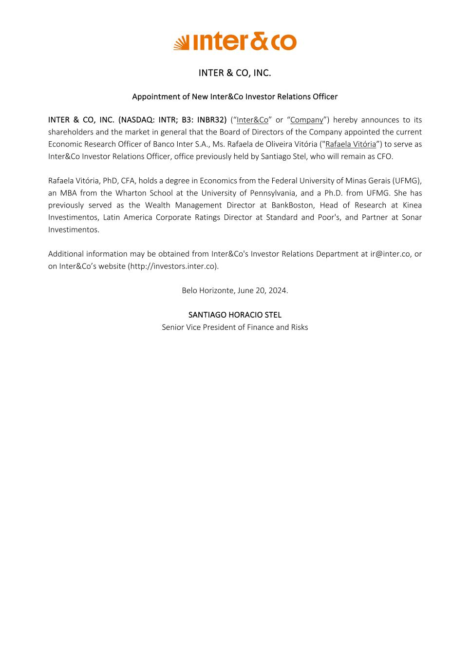 INTER & CO, INC. Appointment of New Inter&Co Investor Relations Officer INTER & CO, INC. (NASDAQ: INTR; B3: INBR32) (“Inter&Co” or “Company”) hereby announces to its shareholders and the market in general that the Board of Directors of the Company appointed the current Economic Research Officer of Banco Inter S.A., Ms. Rafaela de Oliveira Vitória ("Rafaela Vitória”) to serve as Inter&Co Investor Relations Officer, office previously held by Santiago Stel, who will remain as CFO. Rafaela Vitória, PhD, CFA, holds a degree in Economics from the Federal University of Minas Gerais (UFMG), an MBA from the Wharton School at the University of Pennsylvania, and a Ph.D. from UFMG. She has previously served as the Wealth Management Director at BankBoston, Head of Research at Kinea Investimentos, Latin America Corporate Ratings Director at Standard and Poor's, and Partner at Sonar Investimentos. Additional information may be obtained from Inter&Co's Investor Relations Department at ir@inter.co, or on Inter&Co’s website (http://investors.inter.co). Belo Horizonte, June 20, 2024. SANTIAGO HORACIO STEL Senior Vice President of Finance and Risks
