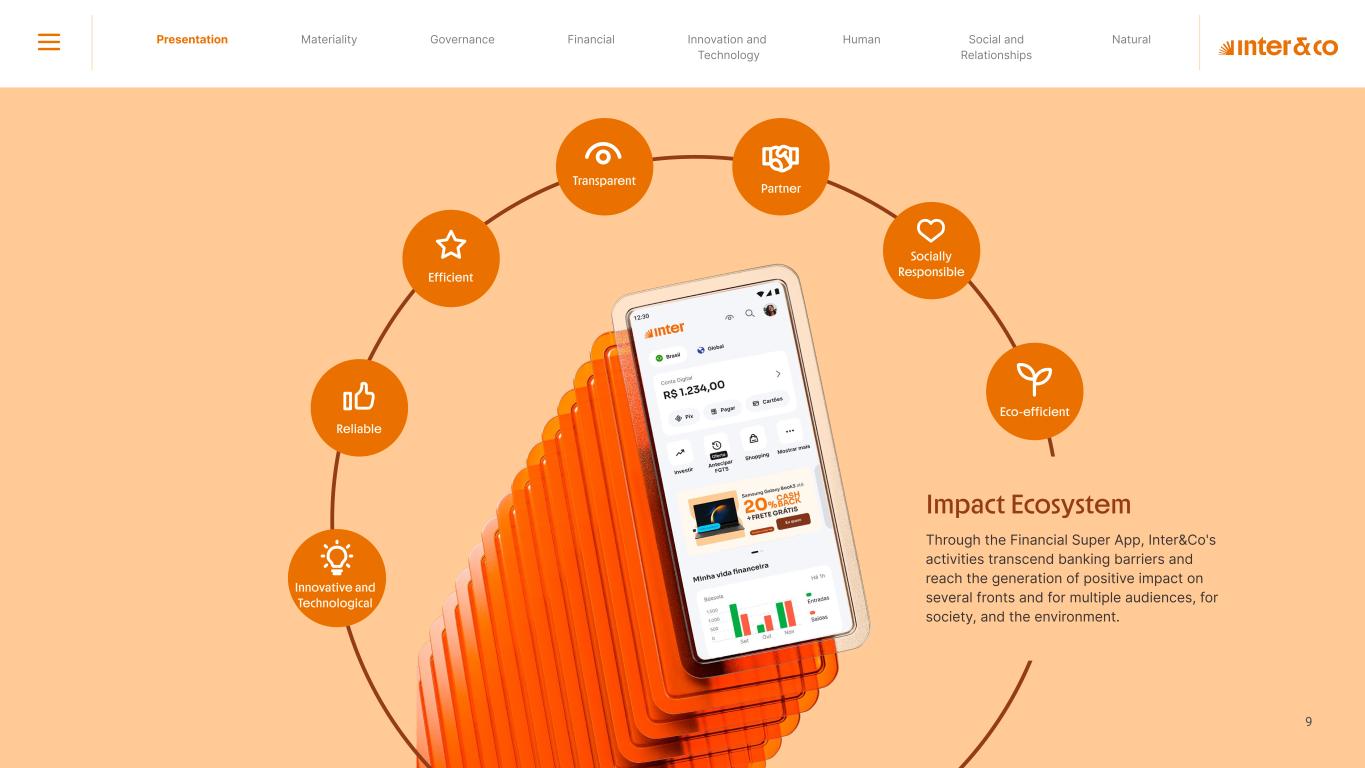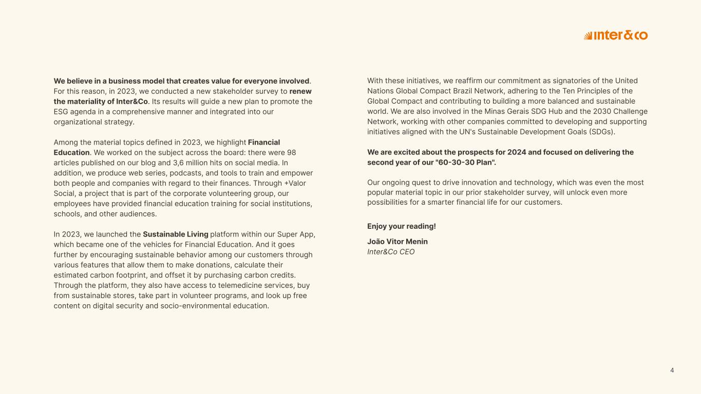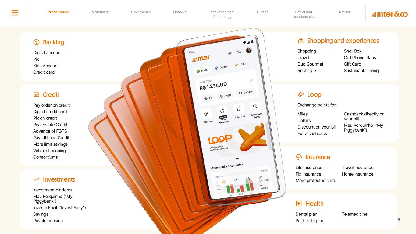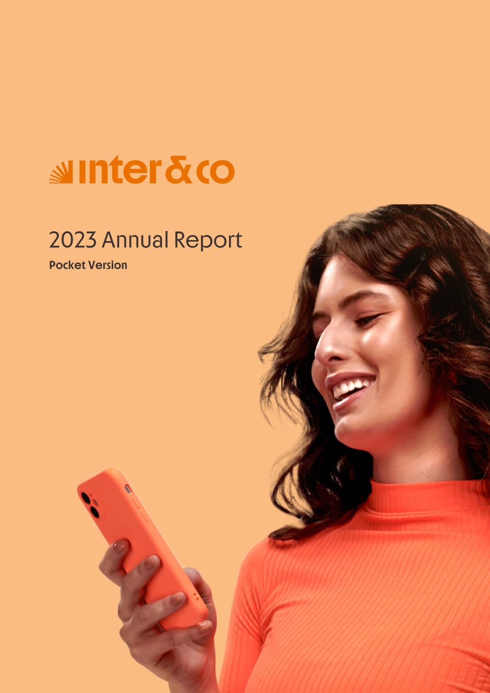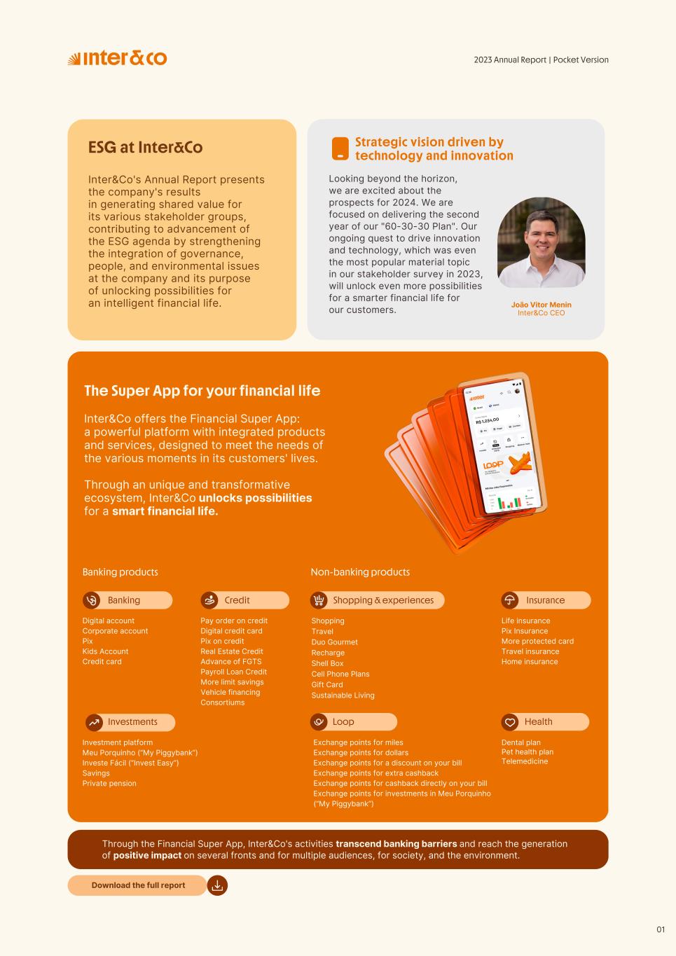 Insurance Health Through the Financial Super App, Inter&Co's activities transcend banking barriers and reach the generation of positive impact on several fronts and for multiple audiences, for society, and the environment. Digital account Corporate account Pix Kids Account Credit card Banking Pay order on credit Digital credit card Pix on credit Real Estate Credit Advance of FGTS Payroll Loan Credit More limit savings Vehicle financing Consortiums Credit Investment platform Meu Porquinho (“My Piggybank”) Investe Fácil (“Invest Easy”) Savings Private pension Investments Exchange points for miles Exchange points for dollars Exchange points for a discount on your bill Exchange points for extra cashback Exchange points for cashback directly on your bill Exchange points for investments in Meu Porquinho (“My Piggybank”) Loop Life insurance Pix Insurance More protected card Travel insurance Home insurance Dental plan Pet health plan Telemedicine Shopping Travel Duo Gourmet Recharge Shell Box Cell Phone Plans Gift Card Sustainable Living Shopping & experiences Inter&Co's Annual Report presents the company's results in generating shared value for its various stakeholder groups, contributing to advancement of the ESG agenda by strengthening the integration of governance, people, and environmental issues at the company and its purpose of unlocking possibilities for an intelligent financial life. Looking beyond the horizon, we are excited about the prospects for 2024. We are focused on delivering the second year of our "60-30-30 Plan". Our ongoing quest to drive innovation and technology, which was even the most popular material topic in our stakeholder survey in 2023, will unlock even more possibilities for a smarter financial life for our customers. ESG at Inter&Co Strategic vision driven by technology and innovation Inter&Co offers the Financial Super App: a powerful platform with integrated products and services, designed to meet the needs of the various moments in its customers' lives. Through an unique and transformative ecosystem, Inter&Co unlocks possibilities for a smart financial life. The Super App for your financial life João Vitor Menin Inter&Co CEO Banking products Non-banking products 01 2023 Annual Report | Pocket Version Download the full report